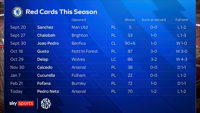 虎扑03月01日讯本轮英超,阿森纳主场2-1击败切尔西,内托染红,切尔西吃到本赛季各项赛事第9张红牌。