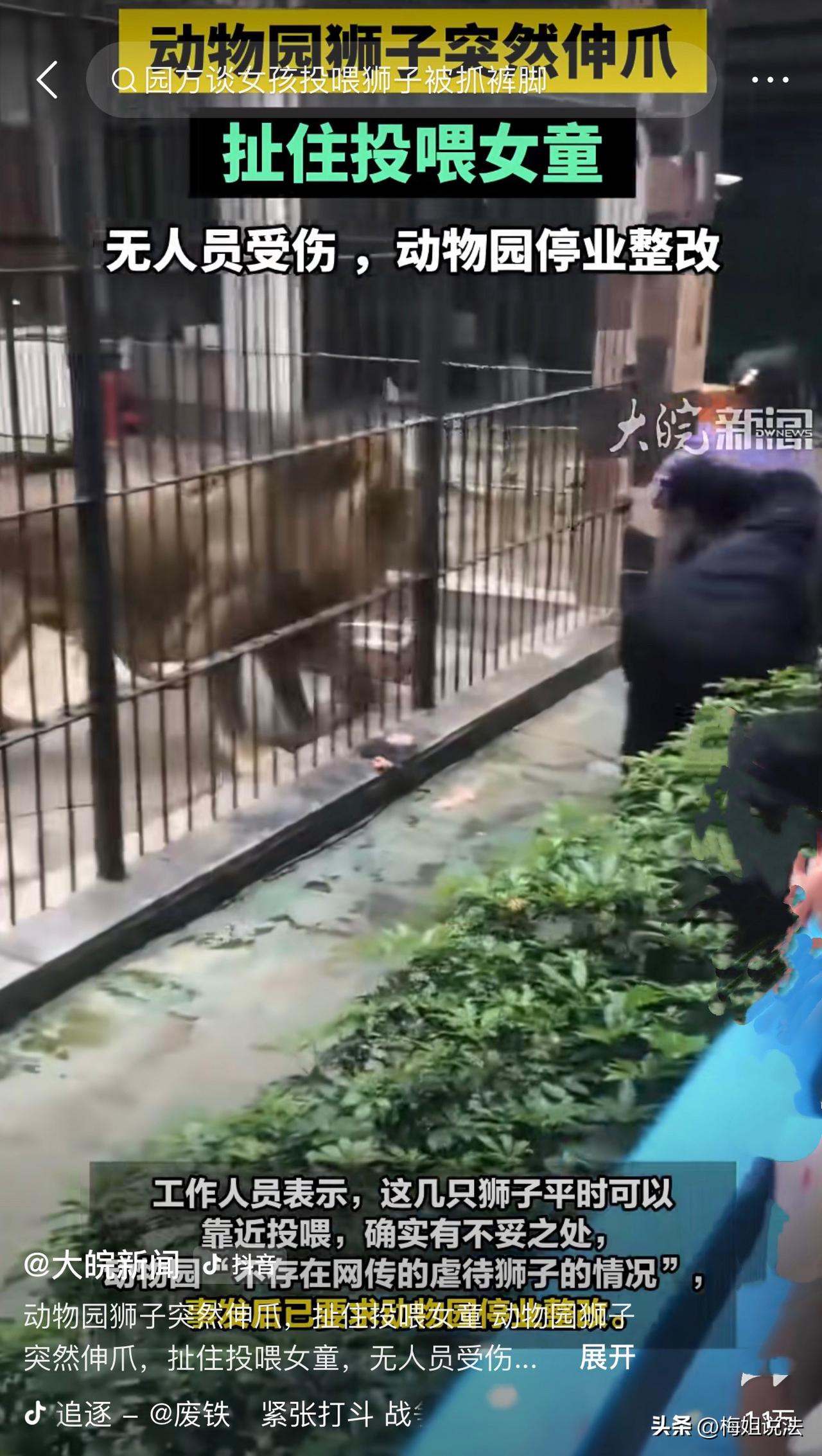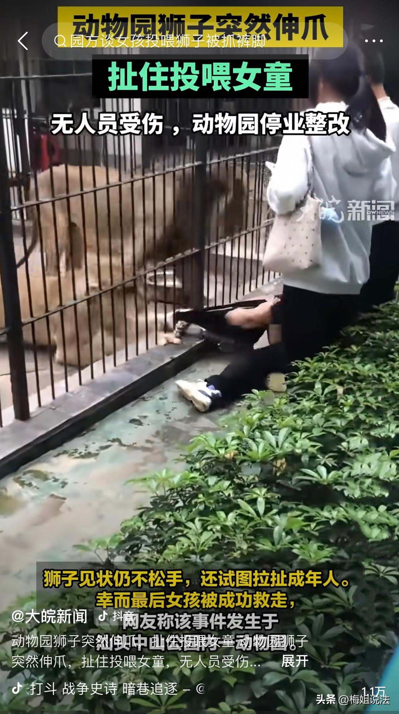 广东汕头,10岁女孩逛动物园,学人拿肉喂狮子,旁边的工作人员见她够不着,就让她走到笼社旁边喂,谁知道狮子突然从栅栏里伸出爪子,一把抓住了了女孩的裤子!女孩吓得大哭,工作人员赶紧搂住她,不停敲笼子,可狮子抓着就是不松! 春天的动物园里到处都是游客,阳光透过树叶落在狮子笼的铁栏杆上,也落在一个小女孩好奇又兴奋的脸上。 她手里举着一小块生肉,学着大人一样投喂狮子,但是即使她踮起了脚跟,却怎么都喂不到,小脸立马挂上失落的表情。 这时候,家里人发现小女孩情绪不对劲,问她怎么了,小女孩说她够不着。 这时工作人员表示可以近距离进行投喂,家长为了满足小女孩的好奇心,便在工作人员的带领下,越过黄色安全线,与小女孩一同走近笼舍旁,直接站在狮子笼舍的金属栅栏旁投喂肉块。 这时意外发生,女孩身体贴近笼舍,伸手递食的瞬间,笼内一只狮子受食物刺激触发捕食本能。 突然隔着铁笼栅栏猛地扑向女孩,伸出锋利爪子,女孩裤脚被狮子锋利的爪子隔着栅栏缝隙牢牢勾住,强大的力量瞬间将女孩拽倒,并往笼内猛烈拖拽。 孩子惊恐尖叫,家长慌忙失措,围栏外的观众也被这突发的一幕吓到,场面一度失控。 万幸的是,身旁陪同的身穿黑色上衣的工作人员反应迅速,立即附身将小女孩护在身前,奋力拉扯,用铁棍敲击栅栏,迫使狮子松爪,短短28秒的对峙后,女孩被拉离栅栏旁边的危险区域成功救下,仅腿部表皮轻微破皮。 小女孩被救下之后,工作人员立马随同家长带领女孩去检查,幸亏女孩只是腿部轻微破皮,在接种完后由家长陪护离开。 目前,饲养员已被批评教育并且调离岗位,家属也已经谅解了动物园。 工作人员表示,这几只狮子平时可以靠近投喂,确实存在不妥之处,动物园“不存在网传的虐待狮子的情况”,事发后,汕头中山公园管理处发布官方通报,确认事件经过并认定责任。 通报明确指出,此次险情并非意外,而是动物园饲养员违规允许游客进入安全隔离区投喂造成,暴露出园区管理不规范、安全措施不到位、操作流程不严格等突出问题。 依据管理规定,园方已对涉事动物园作出停业整顿处理,对违规操作的饲养员进行批评教育并调离岗位,并全面开展安全隐患排查整治,强化从业人员安全培训,杜绝类似事件再次发生。 通过走访了解,涉事动物园为公园内私人承包经营的“园中园”,以付费投喂、近距离互动为卖点吸引游客。 多位游客反映,该园区猛兽区防护设施存在明显缺陷,笼舍栅栏缝隙过大,足以让狮子自由伸爪;安全警示标识模糊不清,工作人员并没有明确有效地劝阻游客靠近危险区域。 事件曝光后,迅速引发社会广泛热议。网友纷纷表示,猛兽天性难泯,圈养动物依然具备攻击性,动物园必须严守安全红线,不能以“互动体验”之名牺牲游客安全。 根据《民法典》相关规定,动物园动物造成他人损害的,适用过错推定责任,除非园方能证明已尽到管理职责,否则应承担侵权赔偿责任。此次事件中,园方设施不合格、管理失职、违规经营,难以免除责任。 但是也有不少网友表示,再怎么说也是猛兽,即使关在笼子里面,也要有一定的安全意识,监护人存在一定的责任缺失问题。 根据《民法典》规定,父母对未成年子女负有抚养、教育和保护的义务。 未成年人身心发育尚未成熟,对危险的判断能力、自我控制能力和避险能力均远低于成年人,尤其在面对狮子这类大型猛兽时,极易因好奇、贪玩而忽视致命风险。 女童主动靠近猛兽笼舍、参与近距离投喂,其行为本身已处于高度危险之中,而监护人未能及时制止、有效看护,是导致险情发生的重要原因之一。 对此,园方应当完善安全设施、加强安全管理,确保游人、管理人员和动物安全。猛兽区必须实行全封闭隔离,严禁开展近距离接触类项目,对未成年人应采取更高等级的安全保护措施。 而监护人应该提前对环境风险进行评估,明确告知孩子猛兽的危险性、遵守规则的重要性,让孩子建立“远离、不靠近、不挑逗”的安全意识。