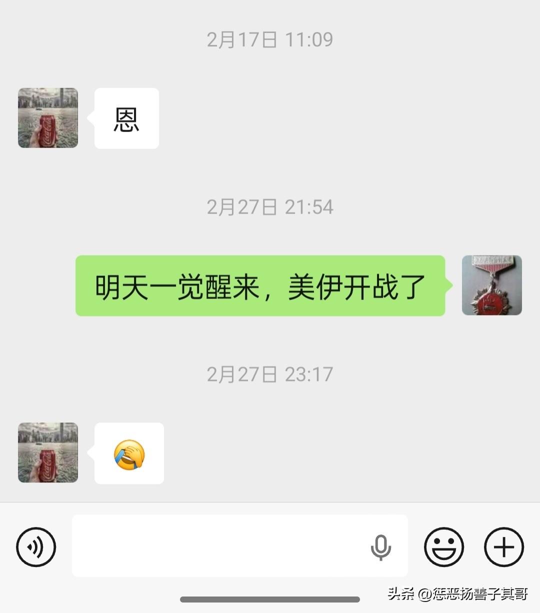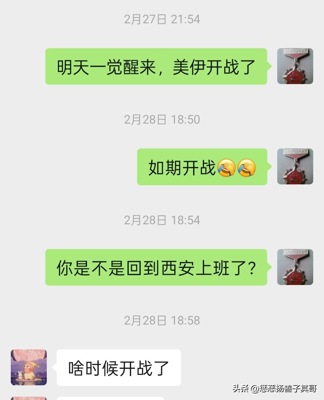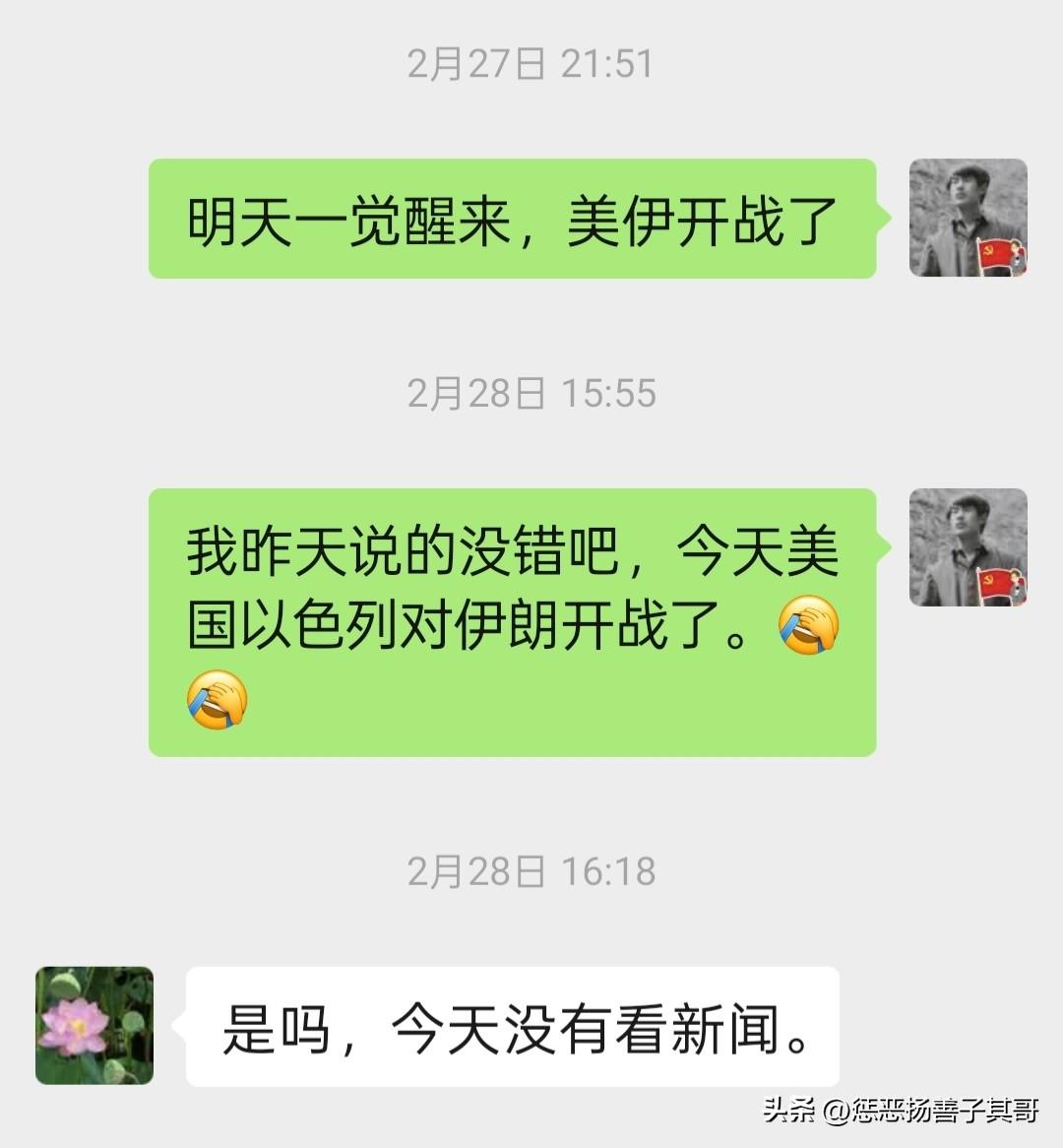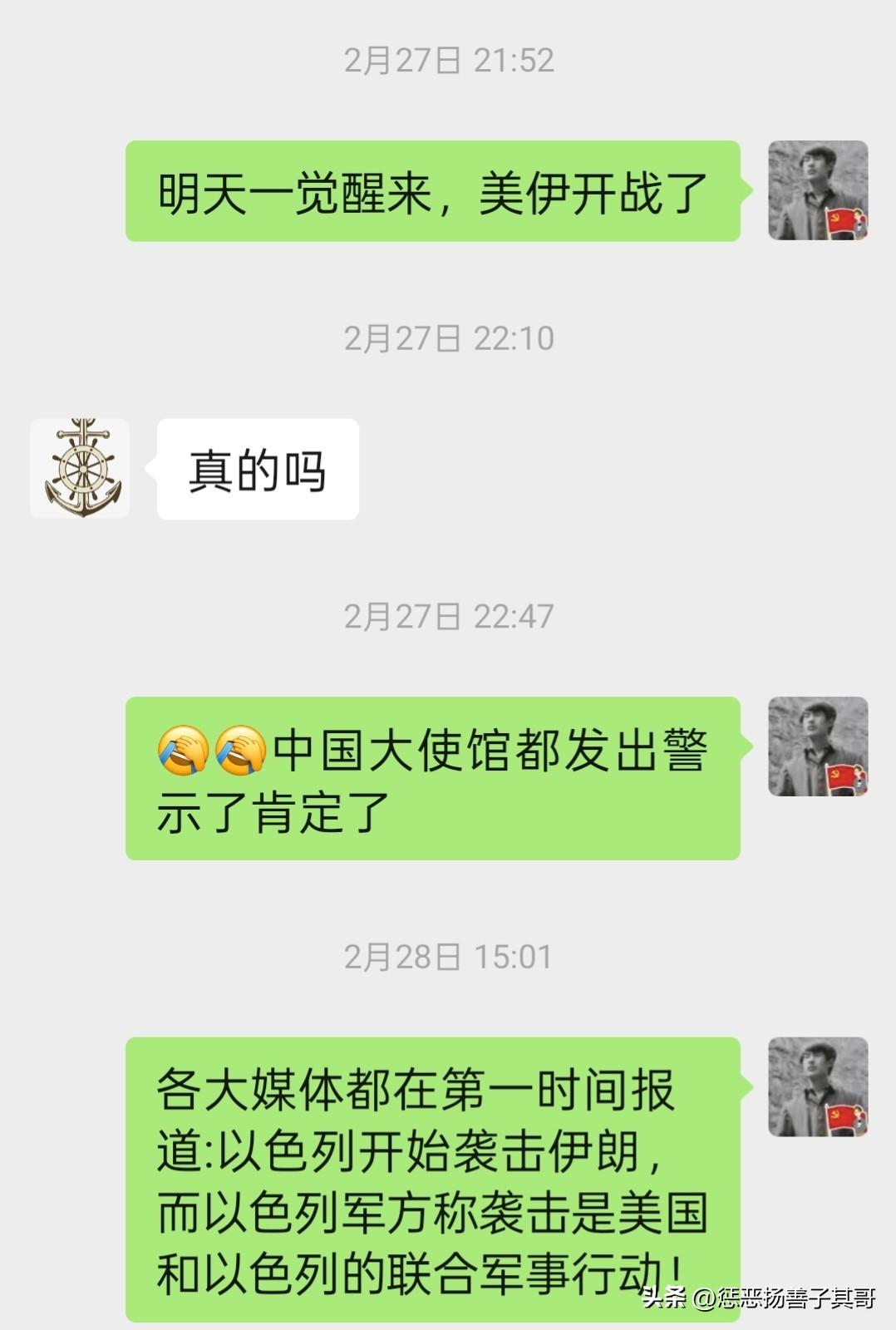 没有想到我2月27日预言的28号“美伊开战”竟然变成了现实。 2月27日晚上睡觉前我和几位朋友聊天,我对他们说“明天早上一觉醒来,美伊开战了。”没有想到我的预料变成了现实。 其实,我27日的预言也是根据中国大使馆发出的安全警示做出的,因为在世界其他国家作出安全警示后,中国也发出了,可见美伊战争是“箭在弦上”了。