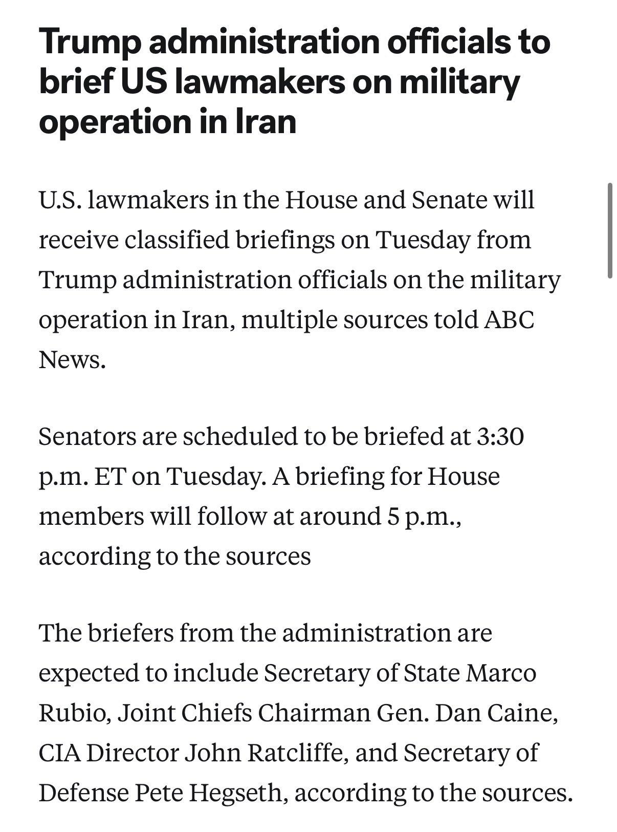 美国广播公司:美国众议院和参议院议员将于周二听取有关伊朗军事行动的机密简报。参议员将于美国东部时间下午3:30开会,众议院将于美国东部时间下午5:00开会。预计国务卿马可·卢比奥、参谋长联席会议主席丹·凯恩将军、中央情报局局长约翰·拉特克利夫和皮特·赫格塞斯将出席简报会。 ABC: U.S. lawmakers in the House and Senate will receiveified briefings Tuesday on the Iran military operation. Senators meet at 3:30 p.m. ET, followed by the House at 5 p.m. ET. Sec. of State Marco Rubio, Joint Chiefs Chair Gen. Dan Caine, CIA Director John Ratcliffe and Pete Hegseth are expected to brief.
