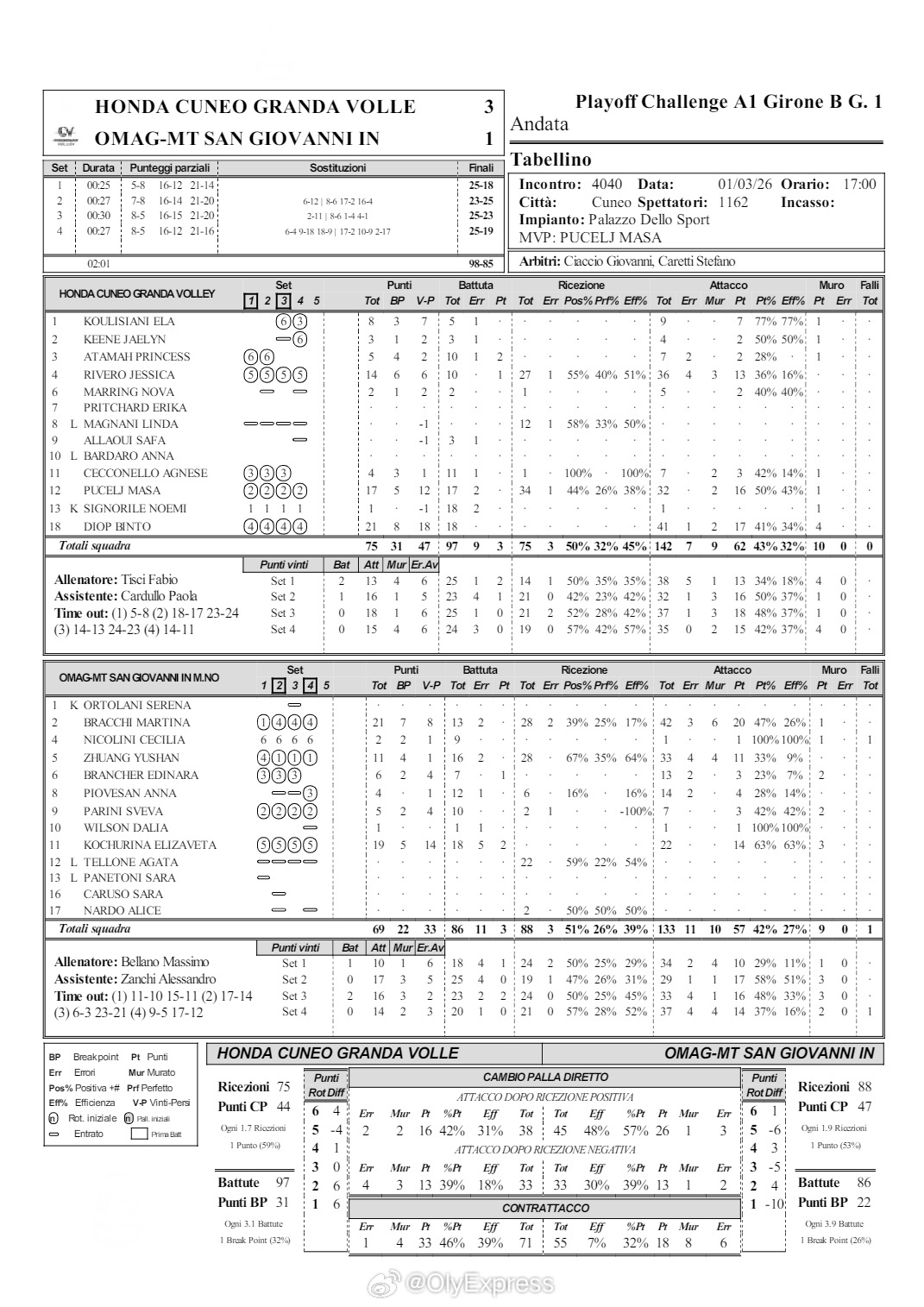 【意甲女排欧挑杯资格战圣乔瓦尼1-3库内奥 庄宇珊11分】国际排坛战报速递中国排球留洋动态 3月1日库内奥,意甲女排欧挑杯资格战小组赛,圣乔瓦尼客场1-3(18-25/25-23/23-25/19-25)不敌库内奥。布拉奇21分、科楚里娜19分、庄宇珊11分(33扣11中),迪乌普21分、MVP普塞伊17分、里沃罗14分。