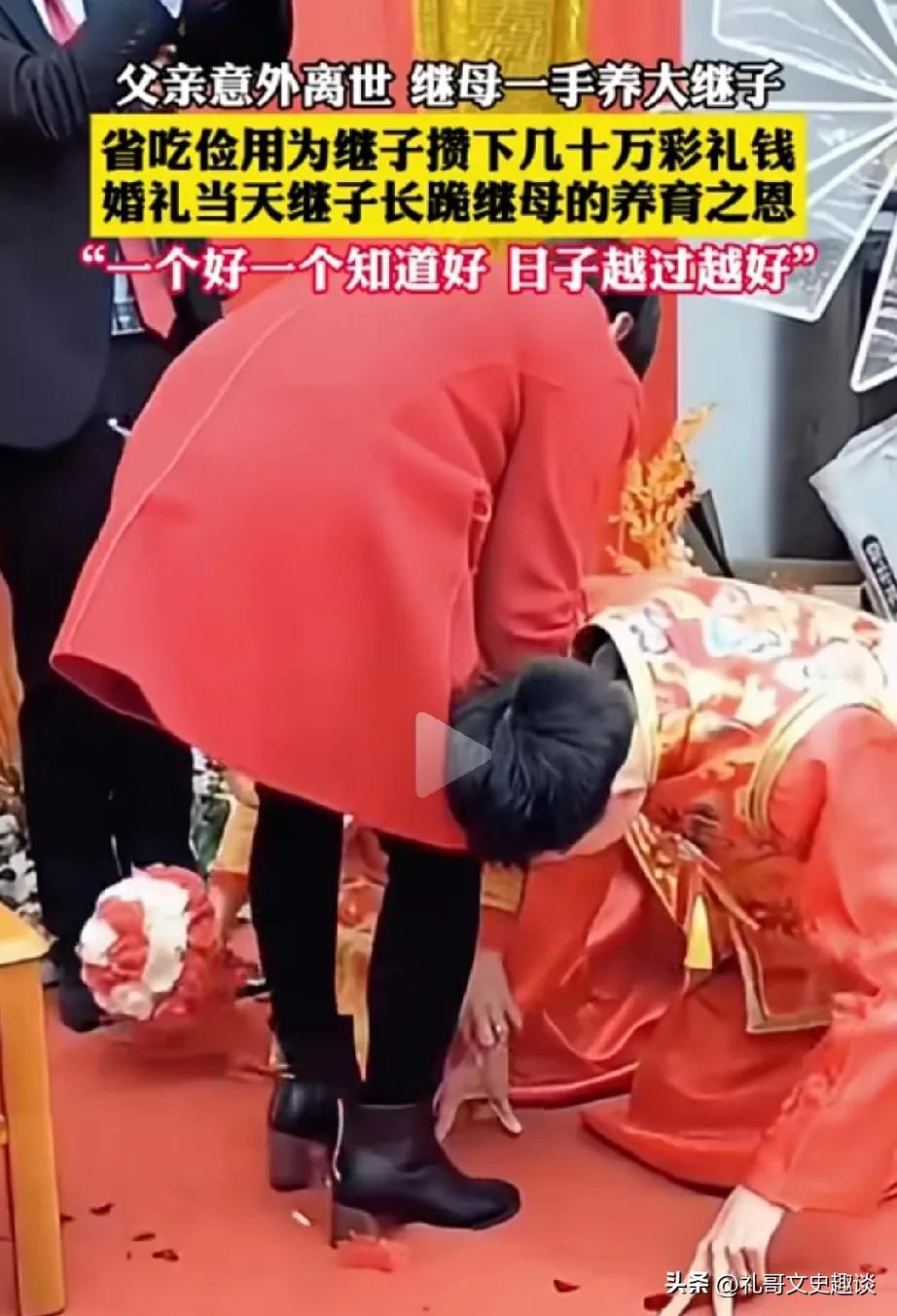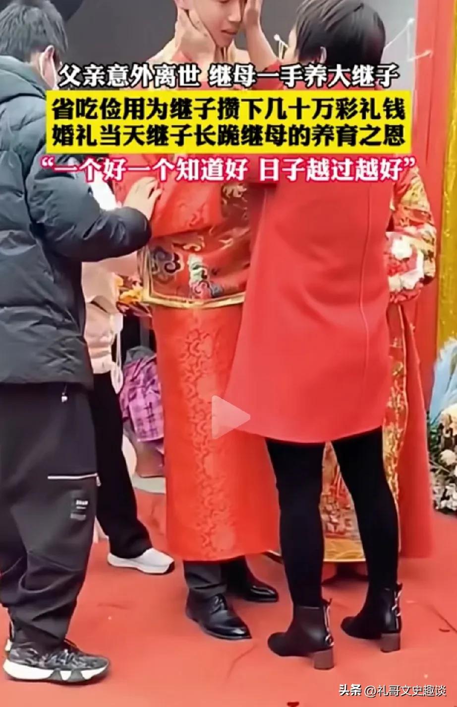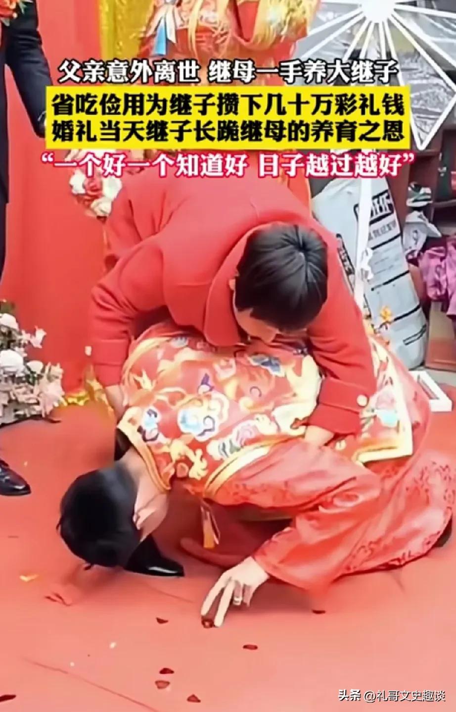 男孩这是有福遇到好人了。女子二婚嫁给带孩子的男人组建家庭,她也没有嫌弃男人的孩子,她尽量去关爱继子,后来又生了一个女孩,由于突发事件男人也因事故去世,但是女人选择留下来照顾俩孩子,通过省吃俭用把俩孩子抚养长大,还为继子举办婚礼,买房子。 继子也看到眼里。知道继母是好人,结婚当天长跪以感谢继母对他的养育之恩。 不得不说双方都是善良的人,继母是好人,继子懂得感恩。希望继子孝敬老人