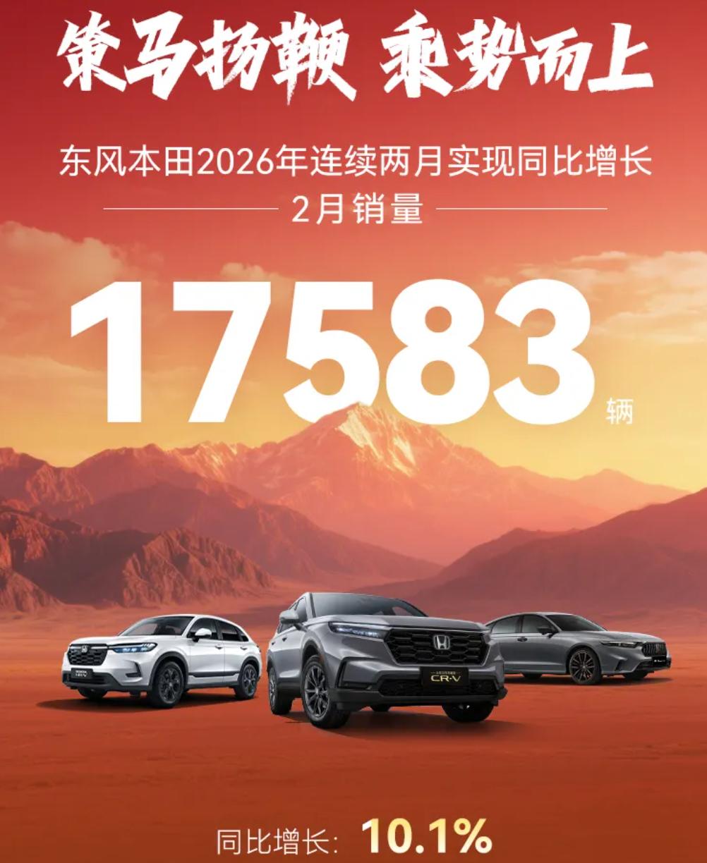 东风本田2月逆势上扬 日前,东风本田公布2026 年2月销量数据,品牌单月销量达17583辆,实现同比增长10.1%,至此2026年已连续两个月取得销量同比增长的成绩,旗下多款主力车型表现亮眼,成为增长核心驱动力。