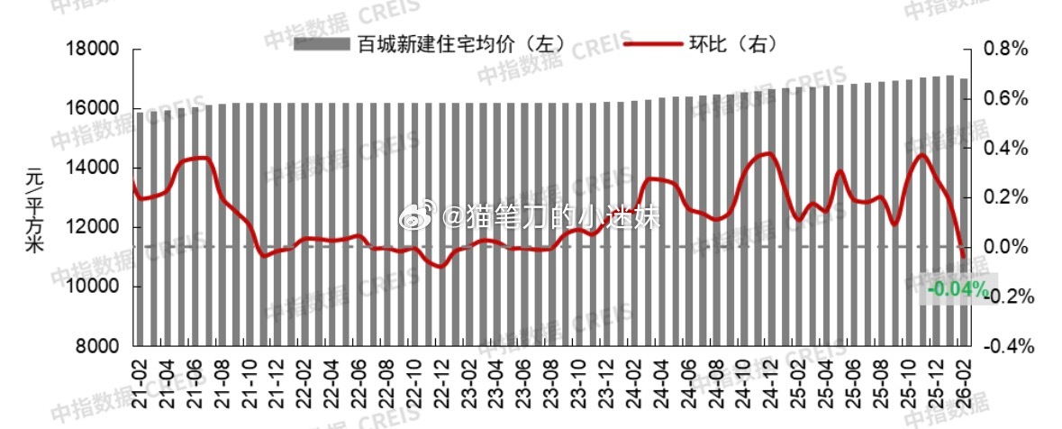 中指研究院数据显示,东东新建住宅价格2月逆上涨速度创三年多最快。 东东100个城市新建住宅平均销售价格2月环比下跌0.04%,结束了1月0.18%的上涨态势。这是自2022年12月以来最大环比跌幅。