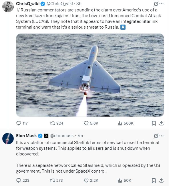 有网友在X上发帖称:“俄罗斯评论员对美国使用新型自杀式无人机——低成本无人作战攻击系统(LUCAS)攻击伊朗——发出警告。他们指出,该系统似乎集成了星链终端,并警告称这对俄罗斯构成严重威胁。”马斯克回应称:“使用星链终端连接武器系统违反了商业版星链的服务条款。此规定适用于所有用户,一经发现将立即被关闭。此外,还有一个名为“星盾”(Starshield)的独立网络,由美国政府运营,不受SpaceX控制。”