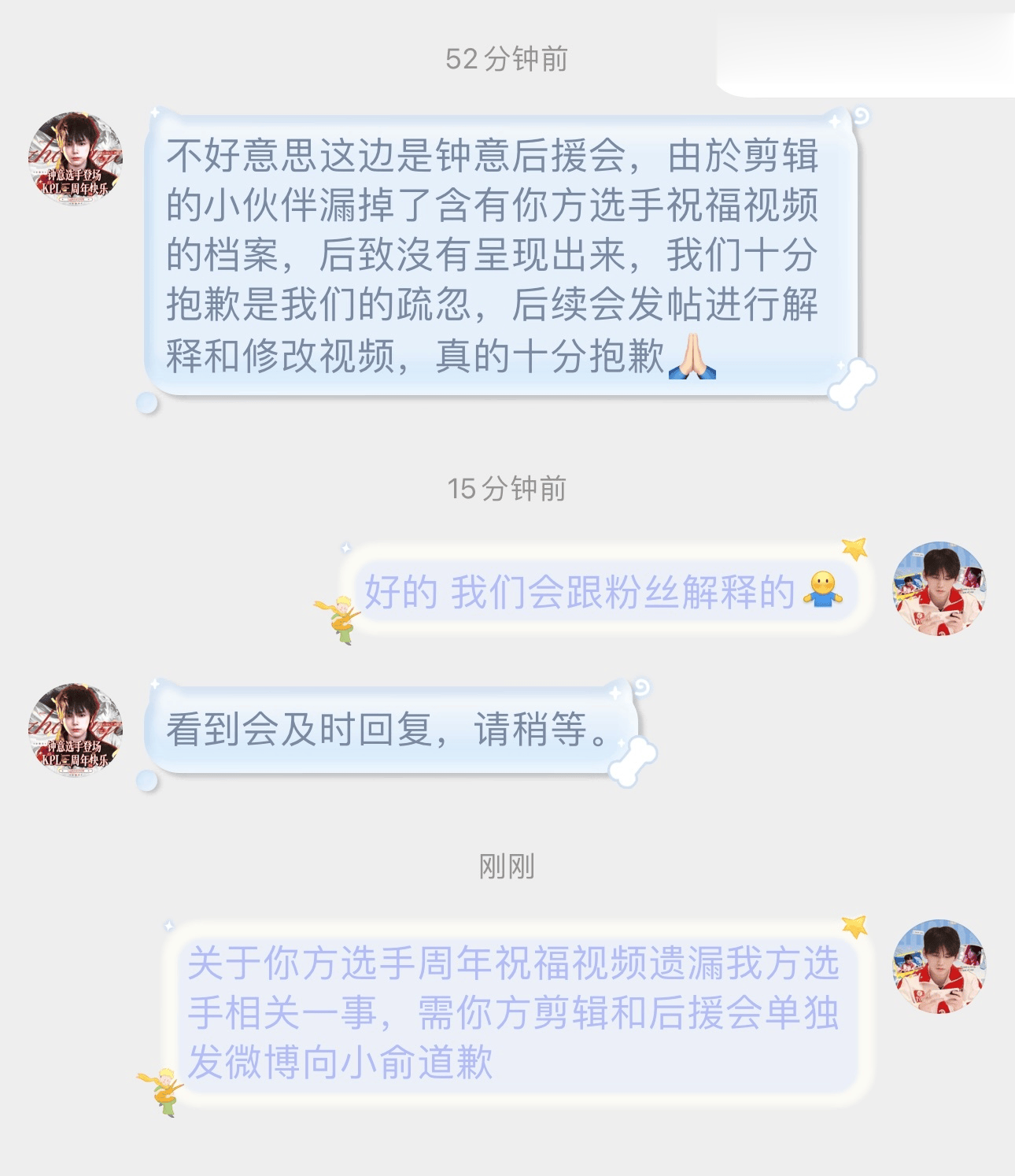 2.后援会负责剪辑周年祝福视频的人员公开发微博向小俞选手道歉。