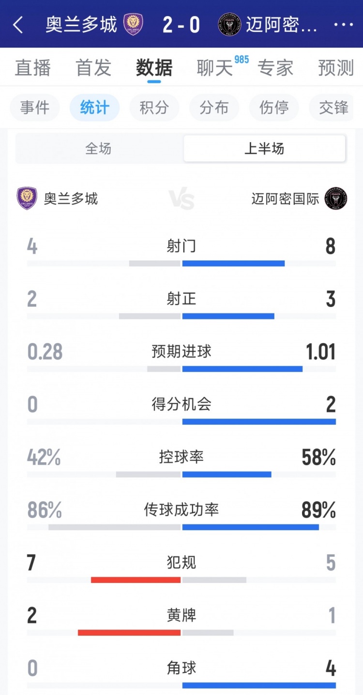 直播吧3月2日讯美职联第2轮迈阿密国际对阵奥兰多城比赛上半场战罢,迈阿密国际暂时0-2落后,以下为双方半场数据对比: