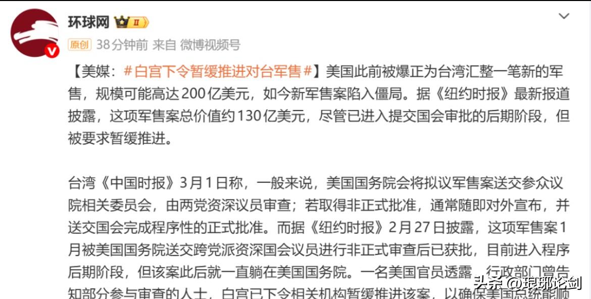 刚要批130亿对台军售,美国突然踩刹车!真相藏不住了 真的太意外了! 美国酝酿已久的天价对台军售,居然在最后关头被按下暂停。 这笔军售有多夸张? 总价值高达130亿美元,不是小数目。 原本已经走到国会审批后期,就差最后一步通过。 武器清单更是针对性极强: 爱国者-3、NASAMS防空导弹、反无人机系统…… 全是冲着所谓“防御作战”去的。 结果呢? 白宫直接下令:暂缓推进。 很多人猜是没钱、没货? 都不是。 真正原因只有一个: 怕在特朗普4月访华前激怒中方,破坏高层会晤大局。 说白了,台湾这颗棋子, 在中美大国博弈面前, 说搁置就搁置,说牺牲就牺牲。 美国这一缓,释放的信号再明显不过: 一切以美国利益优先,台湾从来只是筹码。 所谓“坚若磐石”的承诺, 在现实利益面前,脆弱得不堪一击。 台独势力越是上蹿下跳, 到头来只会被卖得更彻底。 祖国统一大势,谁也挡不住。 持续关注台海热点、国际局势真相, 不被带节奏,不吃信息亏! 关注我,第一时间看懂全球背后逻辑。
