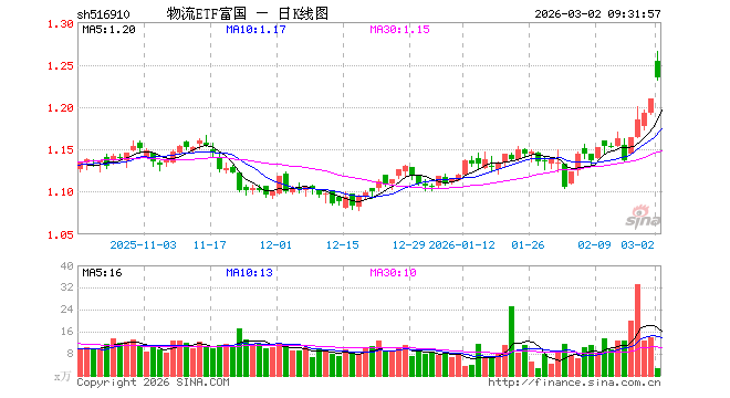 3月2日,物流ETF富国(516910)开盘涨3.72%,报1.254元。物流ETF富国(516910)重仓股方面,中远海控开盘涨3.06%,顺丰控股跌1.51%,京沪高铁跌0.40%,招商轮船涨7.76%,大秦铁路跌0.39%,圆通速递跌0.76%,蔚蓝锂芯跌2.68%,中远海能涨10.01%,物产中大跌1.37%,建发股份跌0.62%。