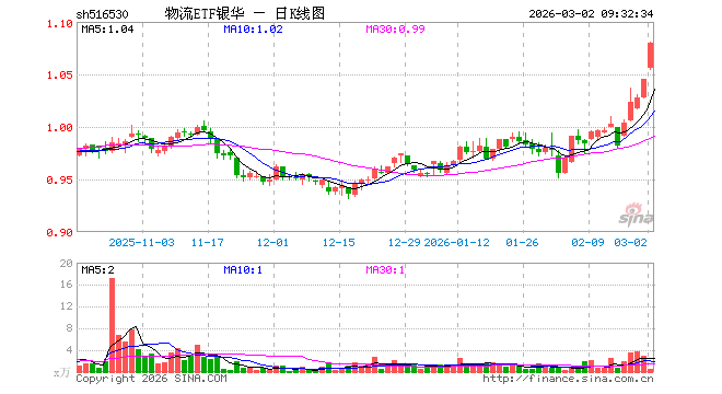 3月2日,物流ETF银华(516530)开盘涨1.05%,报1.056元。物流ETF银华(516530)重仓股方面,中远海控开盘涨3.06%,顺丰控股跌1.51%,京沪高铁跌0.40%,招商轮船涨7.76%,大秦铁路跌0.39%,圆通速递跌0.76%,蔚蓝锂芯跌2.68%,中远海能涨10.01%,物产中大跌1.37%,建发股份跌0.62%。