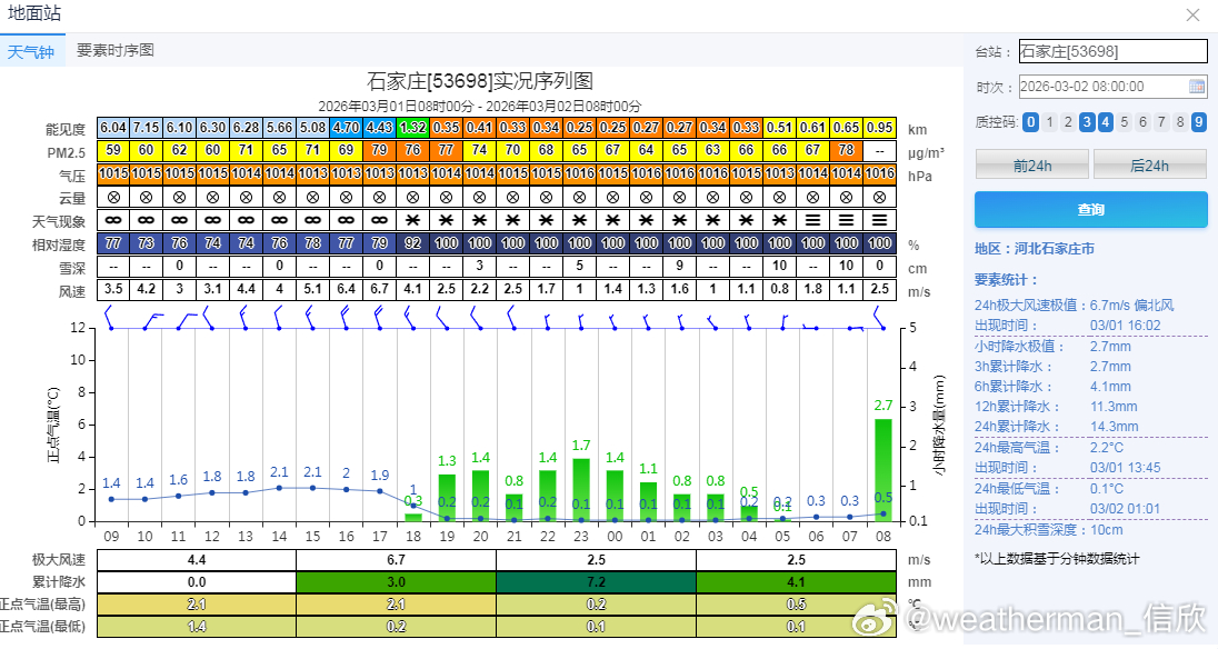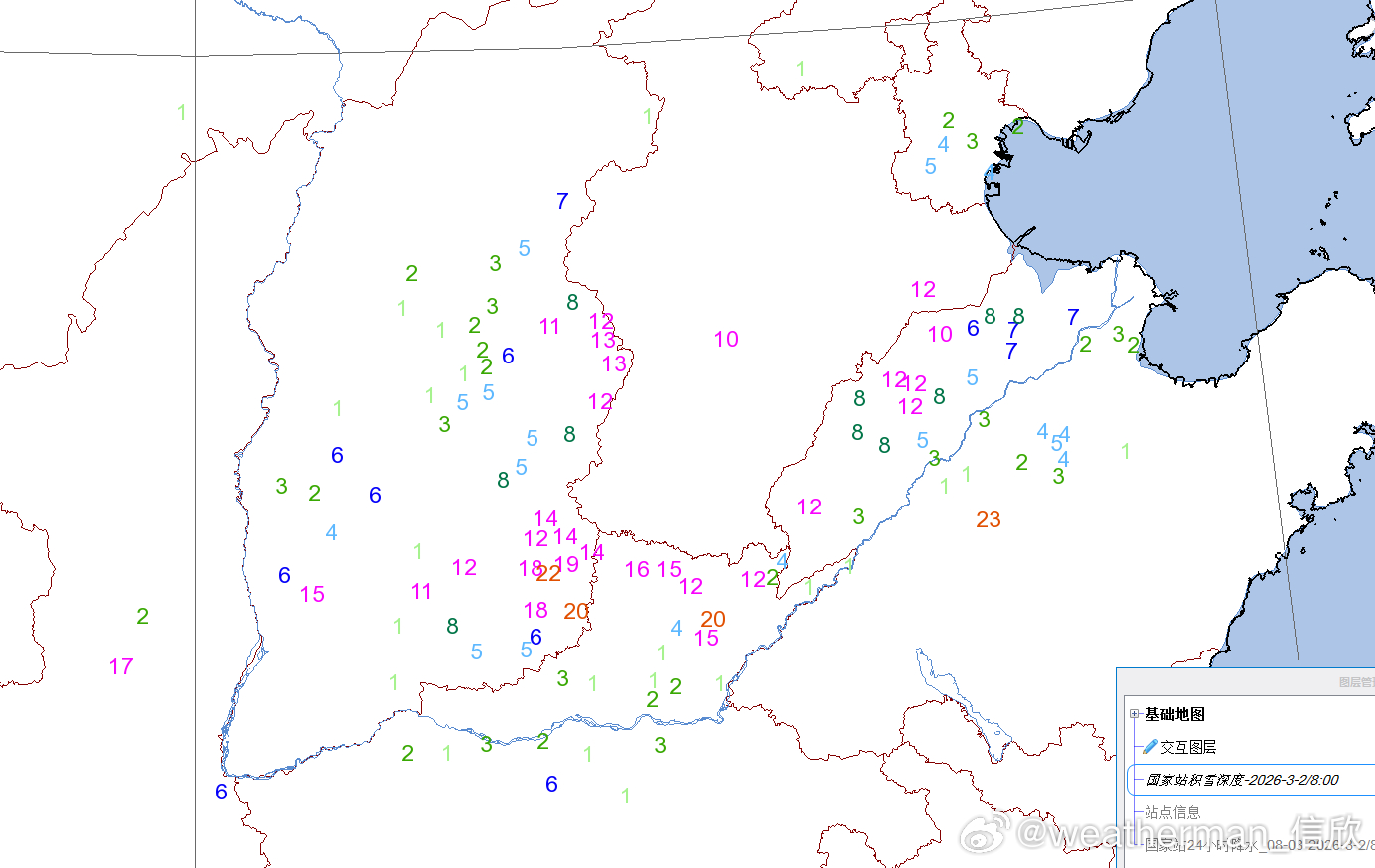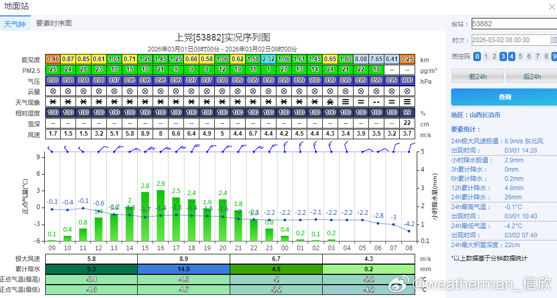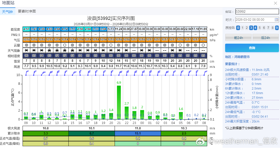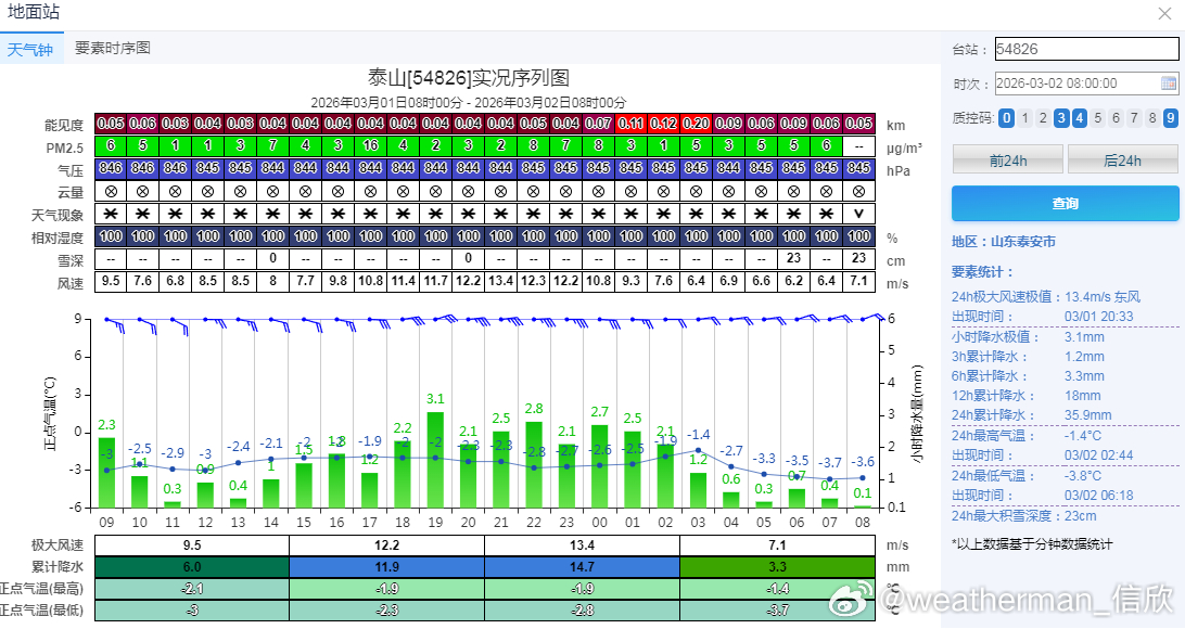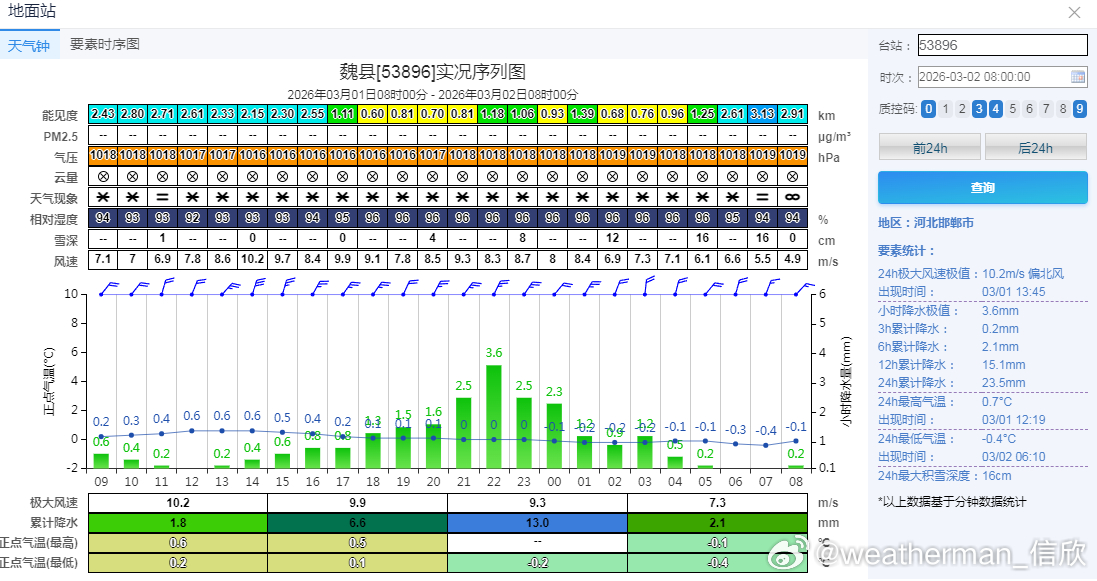 今晨积雪,山东泰山23厘米、河南浚县20厘米、山西长治22厘米、陵川20厘米。此外积雪15厘米以上的有:山西壶关19厘米、长子18厘米、高平18厘米、乡宁15厘米、陕西宜君17厘米、河南林州16厘米、安阳15厘米、滑县15厘米。备注,图9中的河北南部多地未上报积雪,实际也不少。7时河北邱县21厘米。