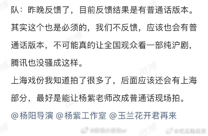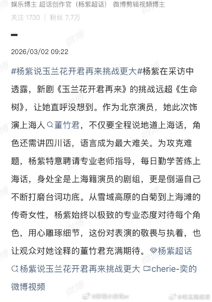 杨紫玉兰花开君再来有普通话上海话两版杨紫新剧要学上海话和四川话杨紫说玉兰花开君再来挑战更大 杨紫新剧《玉兰花开君再来》将推出普通话和上海话两个版本,她需要学习上海话和四川话来贴合剧情与角色,杨紫自曝这部剧挑战更大,期待她在全新挑战中带来的惊喜演绎,也敬佩她的全力以赴。