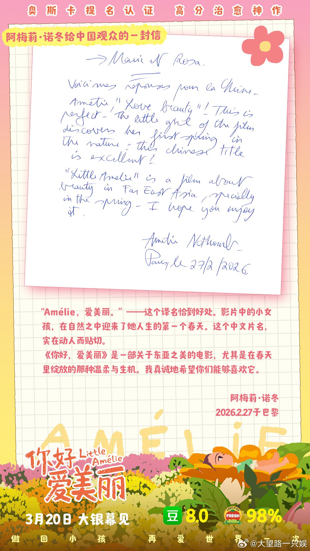 奥斯卡提名动画你好爱美丽定档电影你好爱美丽定档春分 春天就是要看清新治愈的电影啊~一定不能错过这部《你好,爱美丽》!预告里小女孩的视角可爱而充满想象力,画面轻盈像水彩般慢慢晕开,清新脱俗春日适配度拉满!触摸风、感受光、聆听雨,和大自然的互动令人感到幸福满溢。感受、情绪全都细腻地摊在光里。海外上映广受好评,从欧洲到北美斩获了40+奖项和提名,颁奖季黑马之作值得期待!电影原著作者阿梅莉·诺冬还特意为中国观众手写问候信,诚意满满!3月20日,去影院来一场春日约会!春节档马上有戏