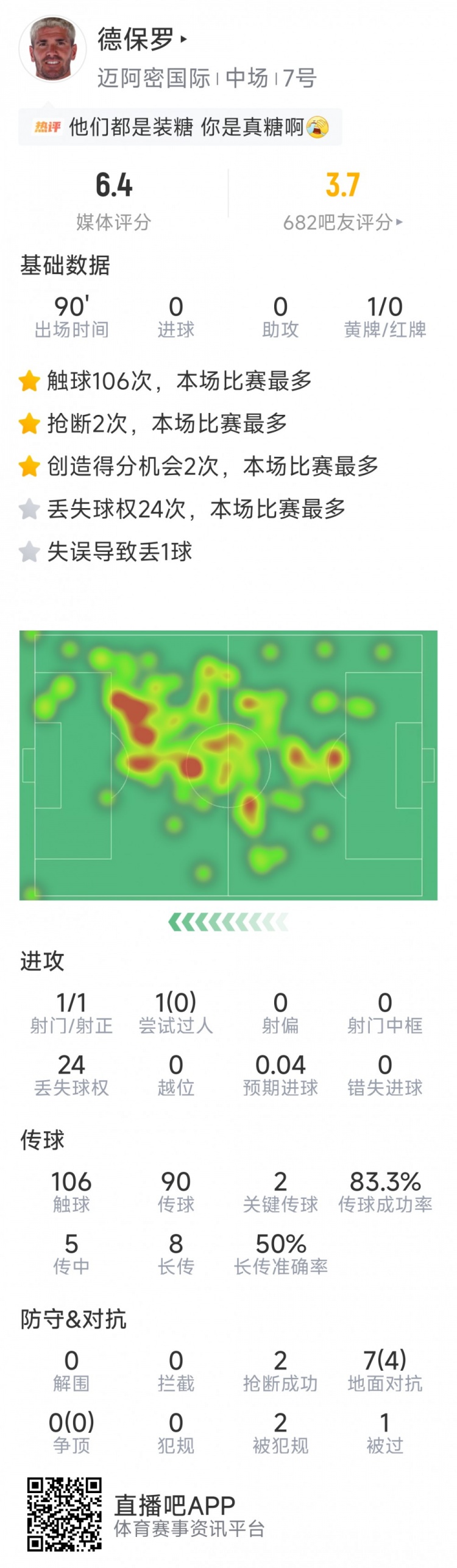 直播吧3月2日讯在本轮美职联,迈阿密国际4-2逆转战胜奥兰多城。本场比赛德保罗传球失误导致丢球,以下为他在本场数据: