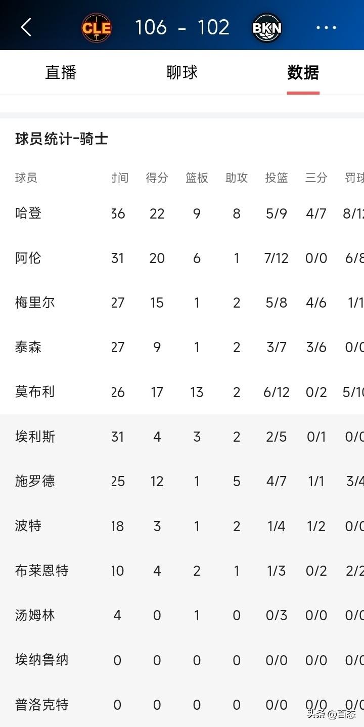 骑士客场挑战篮网,哈登带伤火速复出,骑士106比102篮网,可以说是有惊无险的拿下比赛。哈登又是出场时间最长,9中5,罚球12中8,助攻8个,篮板9个,得分22分,可以说是又当爹当妈的。 有哈登和没哈登球队还是区别很大的,有人说上一场哈登0罚球20多分,这一场12个罚球也是20多分,又说哈登碰瓷。 说实话裁判的判罚对得分影响还是很大的,个人认为能和骑士对抗的,在东部除了凯尔特人其它球队还是有点难。 你们认为骑士的上限在哪里?