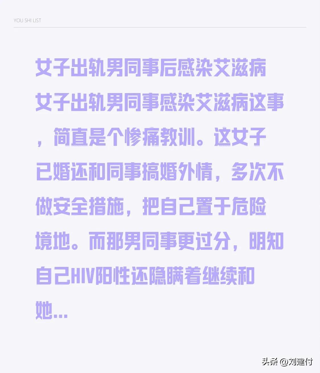 女子出轨男同事后感染艾滋病 女子出轨男同事感染艾滋病这事,简直是个惨痛教训。这女子已婚还和同事搞婚外情,多次不做安全措施,把自己置于危险境地。而那男同事更过分,明知自己HIV阳性还隐瞒着继续和她亲密接触。 这不仅违背了婚姻忠诚,还让女子健康遭受重创,家庭也瞬间崩塌。艾滋病主要通过性接触传播,无保护的非婚性行为风险极大。从法律层面看,男同事这种故意隐瞒传播的行为,要承担民事赔偿责任,严重的还会被追究刑事责任。这事儿给大家提了个醒,别放纵欲望,忽视健康和法律,不然代价可承受不起。