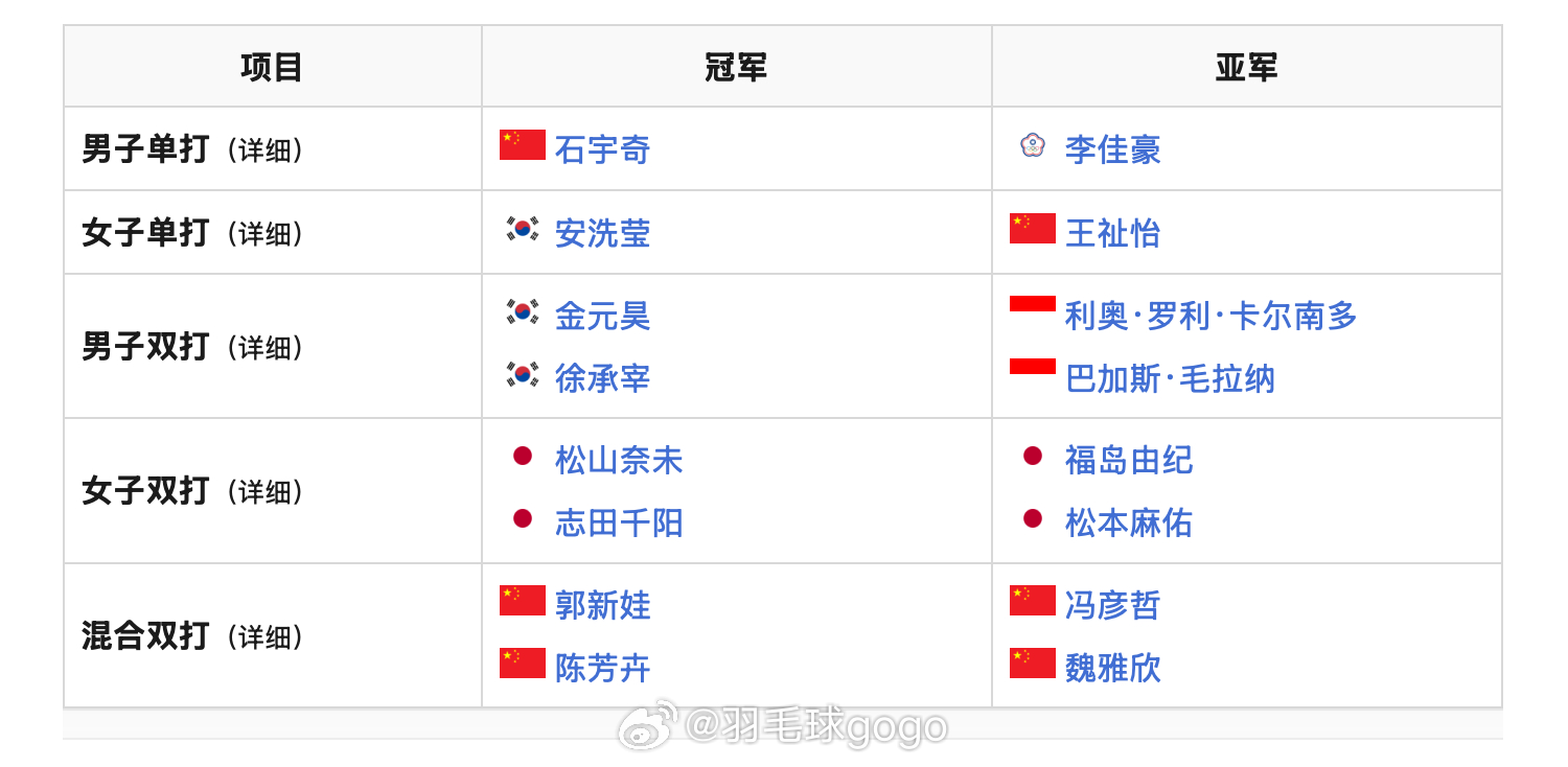 男单:石宇奇🇨🇳女单:安洗莹🇰🇷男双:金元昊/徐承宰🇰🇷女双:松山奈未/志田千阳🇯🇵混双:郭新娃/陈芳卉🇨🇳