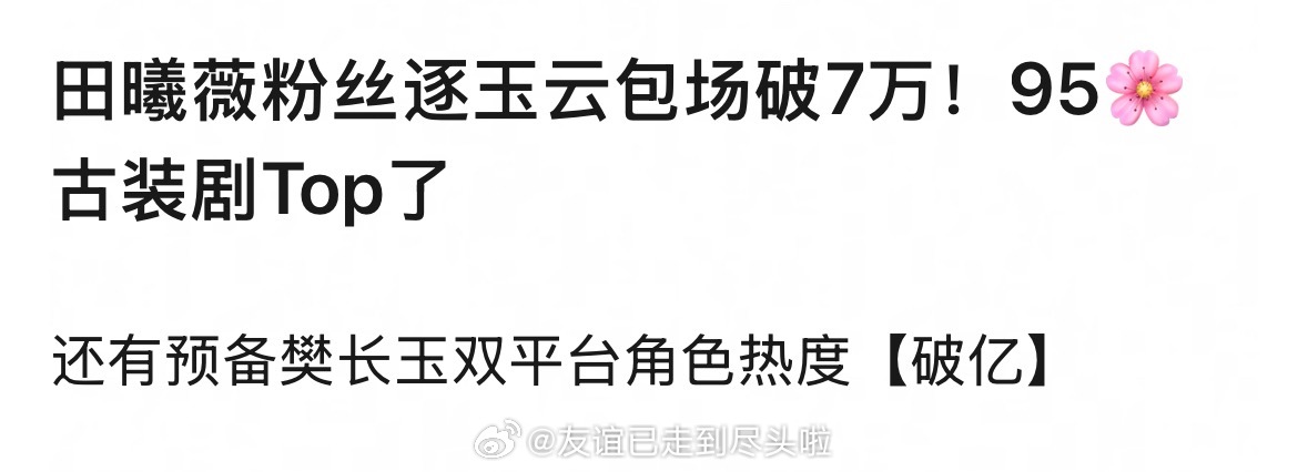 田曦薇逐玉 的云包场破7w,现在已经是95花古装剧的第一了人气冲入上位圈,这次剧