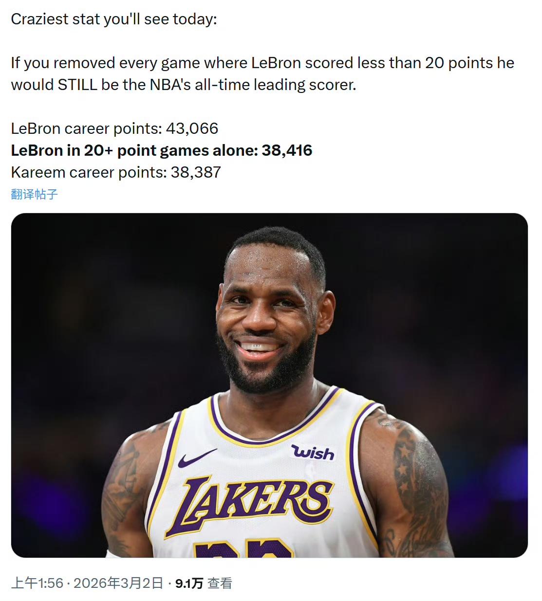 今天让你看看最疯狂的数据: 把詹姆斯所有得分不足20分的比赛全部剔除,他依然会是NBA历史总得分王。 詹姆斯生涯总得分:43,066分 詹姆斯得分20+的比赛中得到:38,416分 卡里姆·阿卜杜尔-贾巴尔生涯总得分:38,387分 这个数据直观地体现了詹姆斯职业生涯的稳定性和统治力:即使不算所有“普通”的比赛,他的高光表现得分总和,也足以超越历史上的传奇球星。 詹姆斯法则 詹姆斯得分王纪录保持多久?