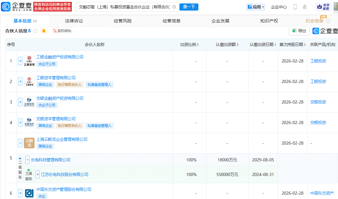 企查查APP显示,近日,交融芯智(上海)私募投资基金合伙企业(有限合伙)成立,出资额13.46亿元,经营范围包含:以私募基金从事股权投资、投资管理、资产管理等活动等。企查查股权穿透显示,该合伙企业由工银金融资产投资有限公司、交银金融资产投资有限公司、长电科技(600584)旗下上海云鲛龙企业管理有限公司等共同持股。