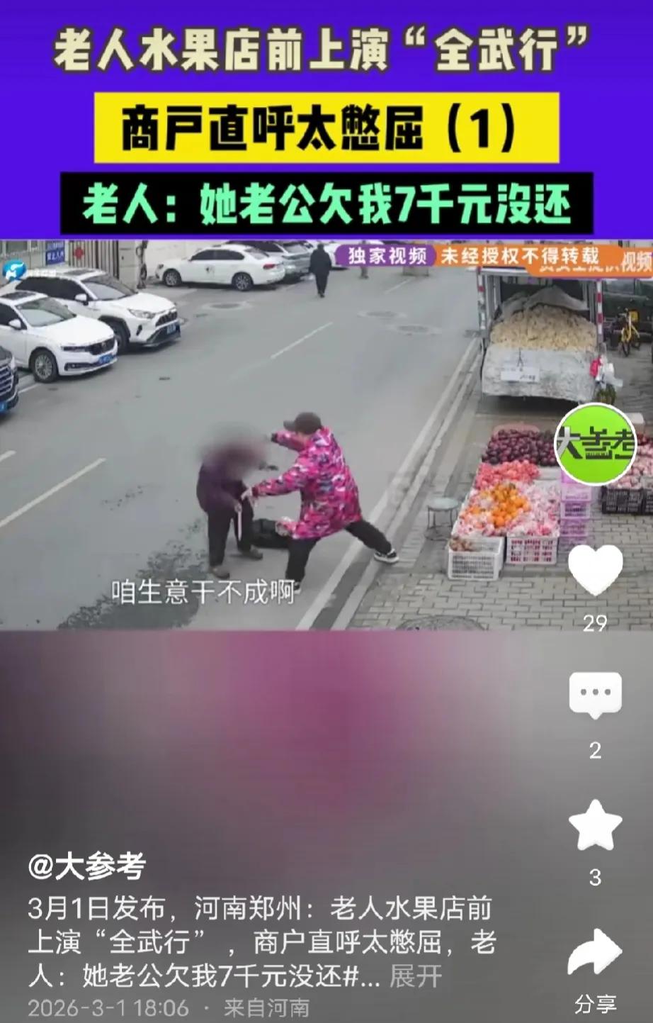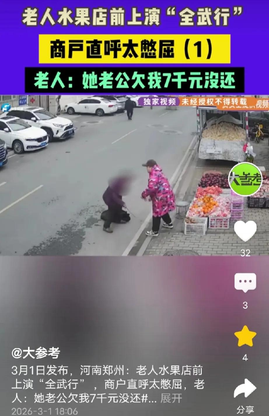 离大谱了!河南郑州,一老太跑到水果店门口撒泼,店家前来劝阻,她拿起木棍就朝人家身上打,还砸烂一堆水果,老太一口咬定店老板欠她7000元不还。店家委屈不已:我们全家人都不认识她,更不可能借她的钱。店家找媒体求助后又报警,结局令人唏嘘。 河南郑州的贾女士最近遇到了一件让她头疼不已的事。 年前的一天,一位80岁左右的大妈突然来到她水果店门口,哭着嚷着要贾女士的老公还钱。 大妈说贾女士的老公欠她7000块钱,欠了很多年一直不还,她说如果不尽快还钱她天天来闹。 贾女士的老公听说这个事后,觉得很冤,因为他根本不认识什么老太,更不可能跟他借钱。 由于贾女士的老公忙,没空来水果店跟老太对质,所以这件事就这么拖着。 直到年初四、初五,老太太又来了两次,每次一来到店门口就直接坐地上,哭天喊地指着店女士的店门,嘴里骂骂咧咧,说店老板没良心,欠她钱不还。 贾女士上前跟她理论就挨她拿拐杖打,她不仅打贾女士,还拿木棍敲打贾女士的水果,导致很多水果都被敲烂,没法卖了。 贾女士头疼不已,2月27日,老太太又来了,贾女士没办法让她老公抽空跟老太太照面,可贾女士的老公根本不认识这个老太太,更不可能跟她借钱。 老太太,看到贾女士老公后一会儿说他欠7000,一会儿又说欠了700、70,根本说不清。 老太太时不时来闹一番,对贾女士的影响很大,她看了闹心不说,店里的人流量也较之前少了很多。 无奈的贾女士找来媒体协助,记者赶到后不久,老太太又来了。 她一来到贾女士店铺门口,直接就坐地上,拿着木棍敲打着地板,委屈地哭起来,说店老板没良心,欠了她7000块钱不还。 老太太一边说还一边拿木棍敲击着地板,一副超级委屈的样子,她的举动引来很多人围观。 贾女士不敢上前劝阻,怕被她打,也怕她把自己摔着了。 记者上前安抚老太太,让她有话起来好好说,因为路上车多人多,怕她被碰到或者撞着了。 老太太告诉记者,店老板那个男的,欠她7000块钱不还,之前她就在隔壁卖水果。 听到这,贾女士突然想起来,十几年前老太太曾经在她们隔壁卖水果,当时跟她婆婆曾经说过几句话,除了贾女士婆婆,他们家其他人都不曾跟老太太说过话。 但是,贾女士的婆婆已经回老家十斤年了。 记者来到不久,贾女士的老公也过来了,记者指着贾女士老公问老太太,你认不认识这个人。 老太太说,我一生气就看不见,也看不清人。 贾女士老公说他们之间根本就不认识,更不可能借钱。 最终贾女士在记者的建议下报了警,并找到社区工作人员前来劝解,可老太还是嘴硬地说店老板欠她钱。 之后记者给老太太儿子打电话,她儿子冷冷地质问:你们欠她钱为什么不还?有什么事你们不用找我,我也管不着。 最后,在记者、民警和社区工作人员的劝说下老太太同意回家。 一伙人跟着老太太回到她家门口,邻居纷纷说,老太太糊涂了,脑子不行了。 把老太太安顿好后,社区工作人员表示,他们会努力开导、好好做老太太的思想工作,让她以后不要去骚扰水果店老板。 老太听完并没有说话。 有人说,养而不教,监护缺位才是最大的恶 八旬老太撒泼闹事,看似是老人神志不清的闹剧,实则是其儿子监护缺位、人性冷漠的必然结果! 老母亲精神失常、无端骚扰他人,作为直系亲属,不仅不主动核实情况、道歉赔偿,反而倒打一耙质问店主,一句“管不着”彻底暴露其不孝与逃避责任的嘴脸。 赡养老人从不是只给一口饭吃,更要承担监护义务、约束老人行为、为老人的过错兜底。 他的冷漠不仅让店主蒙受损失、寒了心,更是将年迈的母亲推向舆论风口,让其成为众人诟病的“撒泼老太”。 这种对亲娘不管不顾、对他人损失视而不见的人,连最基本的做人底线都没有,比撒泼的老太更令人不齿! 《治安管理处罚法》第26条规定,有下列行为之一的,处五日以上十日以下拘留,可以并处五百元以下罚款;情节较重的,处十日以上十五日以下拘留,可以并处一千元以下罚款: (三)强拿硬要或者任意损毁、占用公私财物的;(四)其他寻衅滋事行为。 本案中80岁老太无任何依据多次到水果店门口撒泼,拿木棍殴打店主贾女士,还任意砸烂水果导致财物损毁,她的行为符合该条款中“任意损毁公私财物”和“寻衅滋事”的情形,已违反治安管理规定。 不过,因老太年满70周岁,依据该法第21条规定,公安机关对其作出行政拘留处罚时可不执行,仅能进行批评教育、责令改正,这也是民警最终仅联合社区劝解老太回家的法律依据。 对此,大家怎么看?