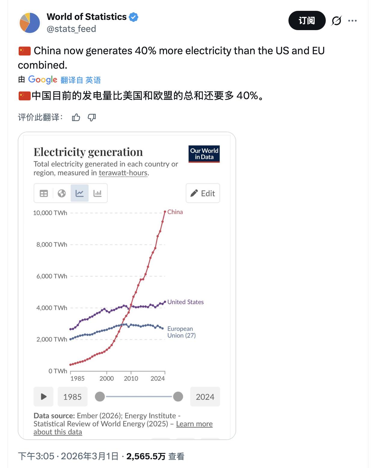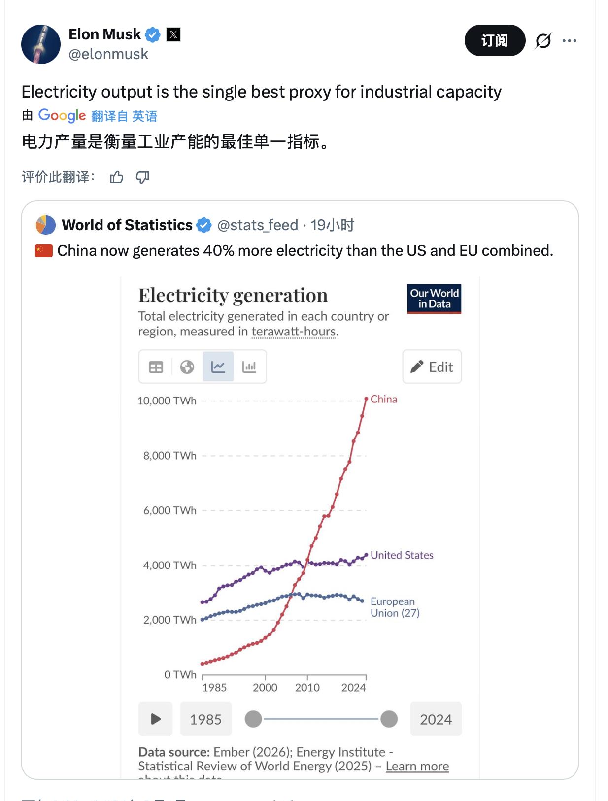中国发电量一骑绝尘。 马斯克:电力产量是衡量工业产能的最佳单一指标。 估计大家也都知道了,这次美国对伊朗的行动,背后有AI的参与(虽然特朗普后来与那家Ai公司闹掰了),而Ai的背后除了芯片,还有电力。马斯克是清醒的,电力就是衡量工业产能的单一指标。 玩过《红警》的朋友都知道,基地发展到后期,肯定要造核电站的,有了充沛的电力,才能爆兵。