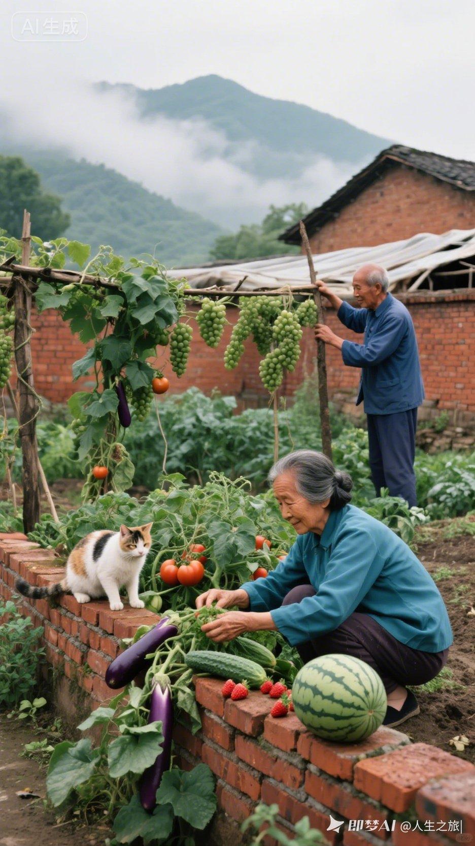 🌿 爷爷种菜,奶奶摘果,猫咪相伴,岁月静好。