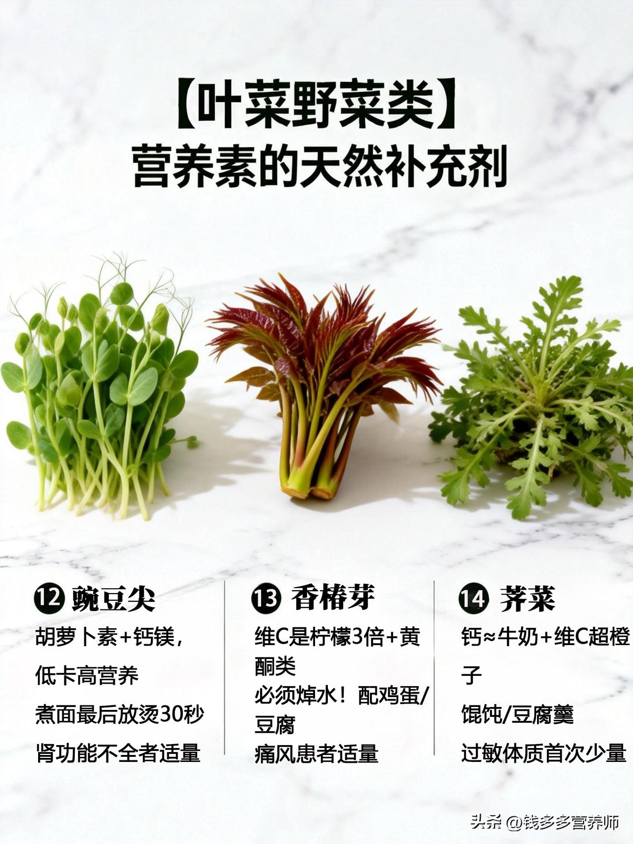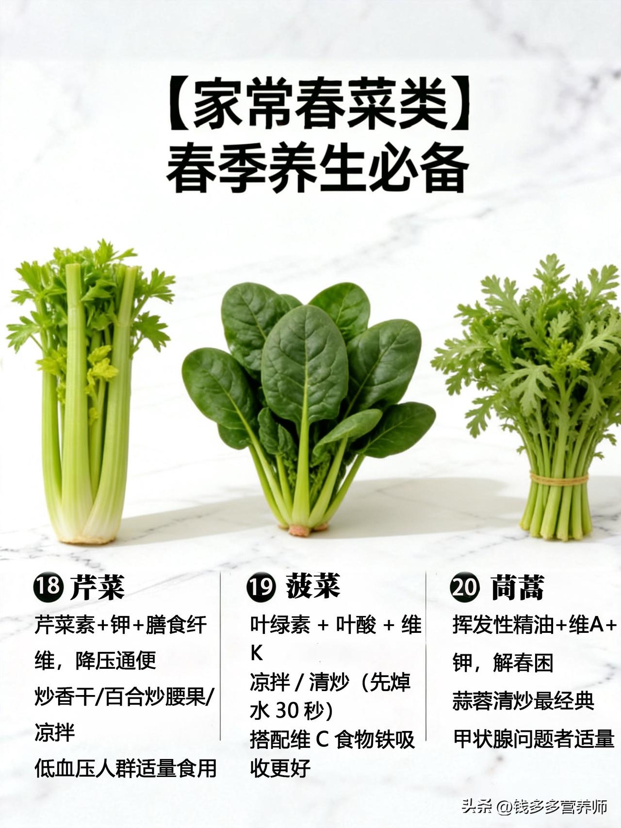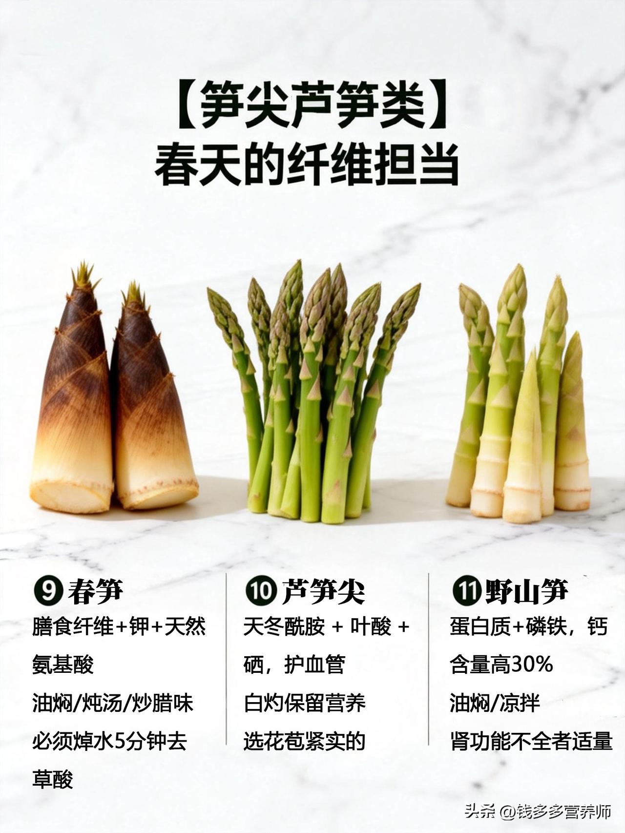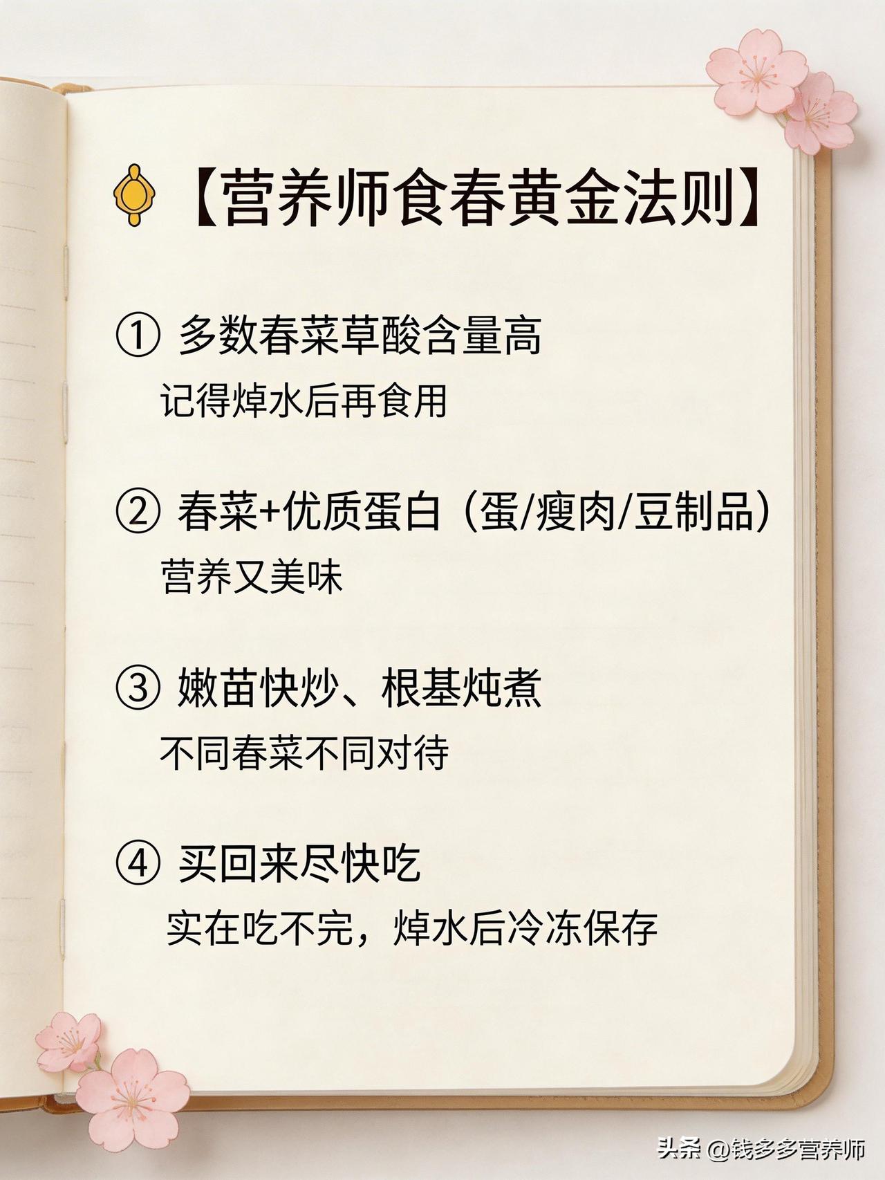 【为什么营养师推荐吃春菜?总结了20种春菜分享给大家[送心]】 春菜不仅是春天的味道,还是春日里的营养库~ 1️⃣春天的蔬菜为了在最佳气候里快速生长,会把大量养分集中输送到嫩芽里。以维生素C为例,春天的荠菜每100克含43毫克,比夏天的高出近一倍。春菠菜的叶酸含量也是一年中最高的,对备孕人群和中老年人心脑血管健康特别友好。 2️⃣天然的“肠道清洁工”。 整个冬天我们吃进去的肉类、精米白面,让肠道负担不小。春笋、芦笋这类春菜富含的膳食纤维,每100克能达到2-3克,能促进肠道蠕动。更重要的是,春菜中的益生元能喂养肠道里的有益菌群,这是花多少钱买益生菌补剂都替代不了的。 3️⃣自带“情绪调节剂”。 很多人不知道,春菜是天然的B族维生素来源。比如豌豆苗、枸杞芽,富含的叶酸和维生素B6参与合成血清素,这种物质直接关系到你的情绪稳定。春天容易疲劳、烦躁,可能不是你状态不好,而是身体缺了这些营养素。 不过要提醒你,吃春菜有三件事必须注意: 1️⃣野菜别乱采:路边绿化带的不能要,有农药残留和汽车尾气双重污染 2️⃣草酸含量高必须焯水。 3️⃣适量是关键:春菜作为蔬菜的一种补充选择,每天蔬菜推荐量为300~500g。其中一部分安排成春菜即可~ 你家最近买了什么春菜?评论区晒出来,我帮你看看营养价值~春菜养肝 春日春菜 春菜做法 嫩春菜 春菜图鉴