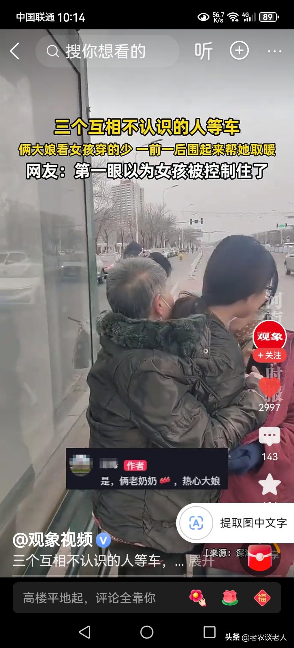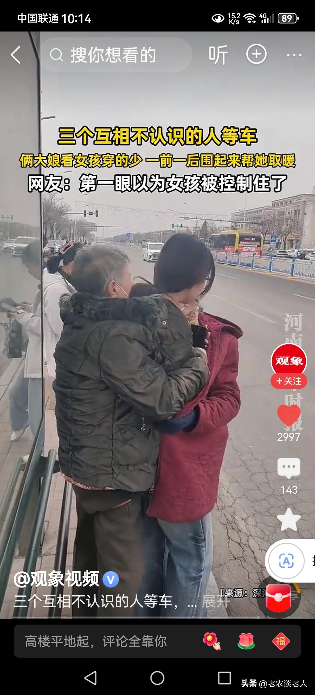 俩大娘看女孩穿得少,一前一后帮取暖!太暖心了! 如今的社会,要想得到素不相识的人,热心的帮助和关怀,是非常不容易的事情,也是非常难得的事情。 据媒体3月2日报道,在城市街头的路边公交站上,一女孩在寒冷的天气,穿得非常单薄,全身冷得直打啰嗦,在等公交车。 有两位年过六旬白头苍苍的女性老人,看到这位女孩冻成这个样子,心都痛了,便主动的一前一后,把她抱围了起来,用自己的身子给她起暖,害怕她冻坏了身子。 看起来这两位老妇人小小的举动,却温暖了正在瑟瑟发抖女孩的身子,让人感到热泪盈眶。 透过这一幕小小的感人的事迹,就能看出人性的温暖,人间都向善的人。 一个需要人帮助的人,得到了人家一个善意的微笑,获得一个不经意的举手之劳,哪怕是一分钱,一片饼干,一个包子,都会挽救一个需要人帮助的冰冷的心,让那个人感到人间是无比的温暖,无限的美好。 这一个故事的三个主人,都是三个独立的主体,三个互不相识的人,能够集聚围在一起,两位老人用自己的身体,能给中间的女孩提供温度,真是一种善意的举动,确实让路边等车的人感到无比感动。 谁说人间温暖少?谁说人间善人少?谁说人间好人少?通过此事例可以看出这些问题都不成立,都是假的,都是悖论。 以上是本人观点,如有不妥,请大家在留言区处留下你宝贵的意见,并积极参与评论。 问界M9祝您新年手到福来俩大娘看女孩穿得少 一前一后帮取暖