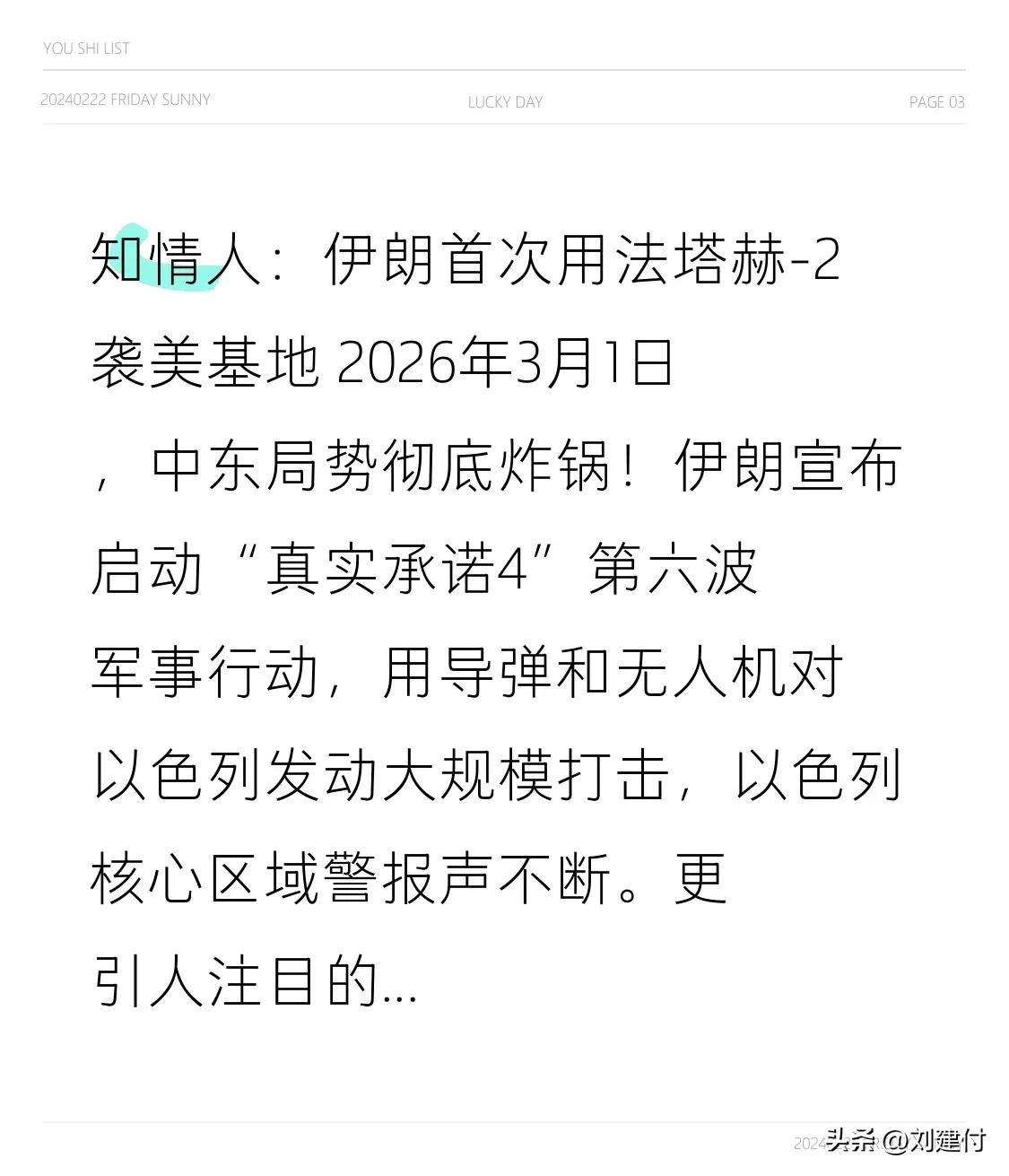 知情人:伊朗首次用法塔赫-2袭美基地 知情人:伊朗首次用“法塔赫 - 2”打击美基地 2026年3月1日,中东局势彻底失控。伊朗宣布启动“真实承诺4”第六波军事行动,用导弹和无人机对以色列发动大规模打击,以色列核心区域警报声不断。 更值得关注的是,伊朗首次使用“法塔赫 - 2”高超音速巡航导弹,精准打击27个美军基地,还直击以军总司令部和国防工业园区。伊朗革命卫队高级指挥官贾巴里警告特朗普,此次反击仅用“陈旧库存”,后续还有神秘武器投入战场,威力远超想象。伊拉克亲伊朗武装响应突袭美军基地,伊拉克为哈梅内伊遇害哀悼3天。这一仗改写中东地缘格局,冲击全球。 美军攻打伊朗 美国对伊朗空袭 伊朗命中目标