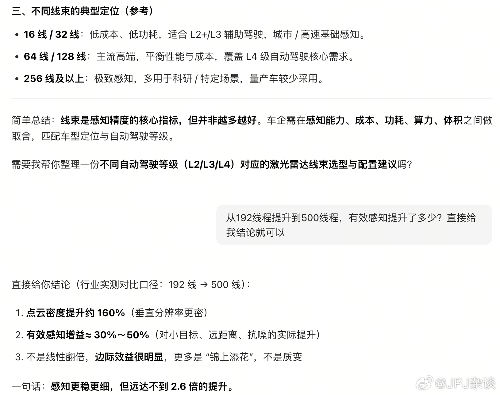 其实不然,有效感知的提升大概在30%-50%,主要体现在小目标、远距离、抗噪的提升上。据资料显示,256线以上的激光雷达主要用于科研等极致感知场景,民用量产车上较少采用。至于原因也非常简单,成本。