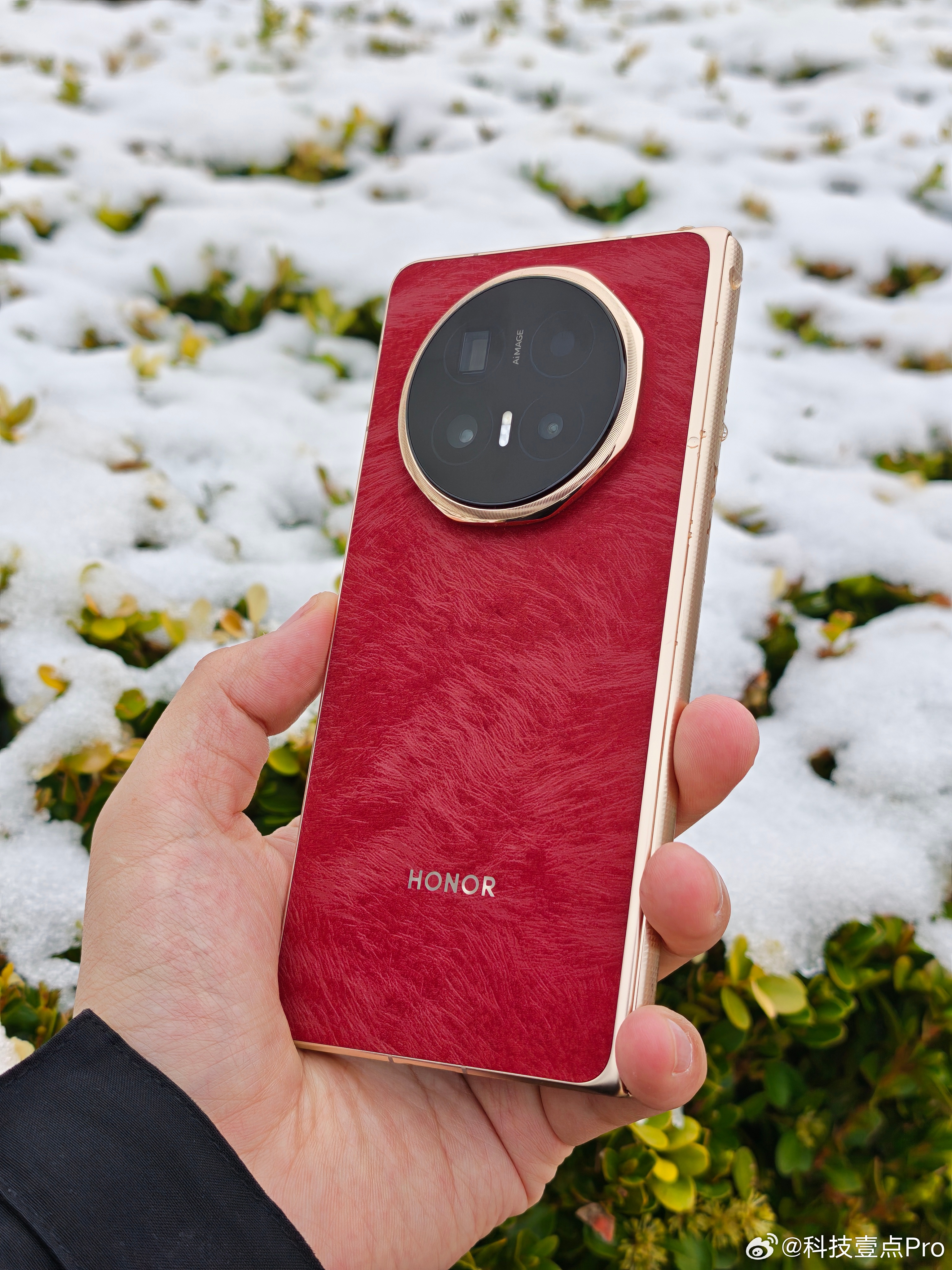 今早带着荣耀Magic V6出来拍了点照片,赤兔红放在雪里还挺好看