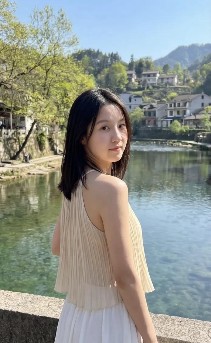 古风小镇的少女,静坐水边,恬静如画。游山玩水,面相好美湖边温柔少女 湖畔白衣少女