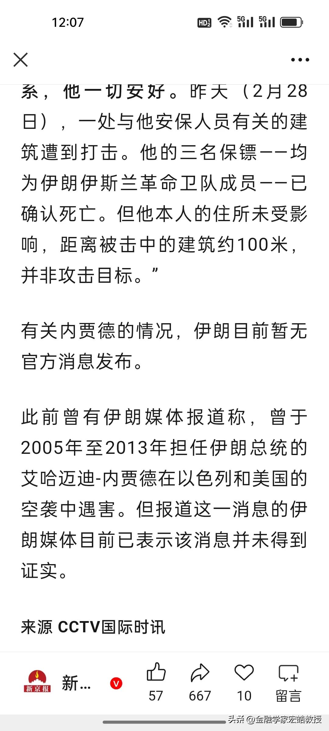 原来伊朗前总统内贾德还活着?六分钟前看到CCTV国际时讯消息,内贾德的亲信说与内贾德还在保持联系,被袭击死亡的是内贾德的三位保镖,不是内贾德。 难道伊朗官方媒体也有失误的时候?战场上真真假假有时候确实难辨,伊朗媒体是有意为之的战略还是真疏忽报道了假消息,还等伊朗官方媒体出来澄清。