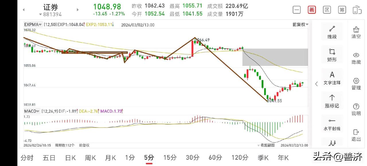 聊聊证券板块(2026.3.2) 今天市场整体走势比较弱,除了油服,军工等少数板块上涨外,其它都不是很理想,但总体跌幅可控,无需忧虑。证券板块虽然今天下挫力度比较大,但后面几天会有所收复,操作上宜考虑持股观察为主。 1.从30分钟图一上看,上周五构建了三卖,那么今天的下跌是可以预期的。后面几天应该会围绕三卖做中枢震荡,从而形成日线三卖的过程,就目前而言,此处并没有好的买点,还需耐心等待几日。 2.从5分钟图二上看,临近上午收盘,虽有所反弹,但上午下挫力度比较大,反弹幅度并不会很大,下午还会有一个探底过程,总之,即使后面几天会有所收复,但对小白来说,操作难度比较大,可继续考虑持股观察即可,若后面有大的操作机会,我也会做出友情提醒。天南地北大拜年 证券板块解析