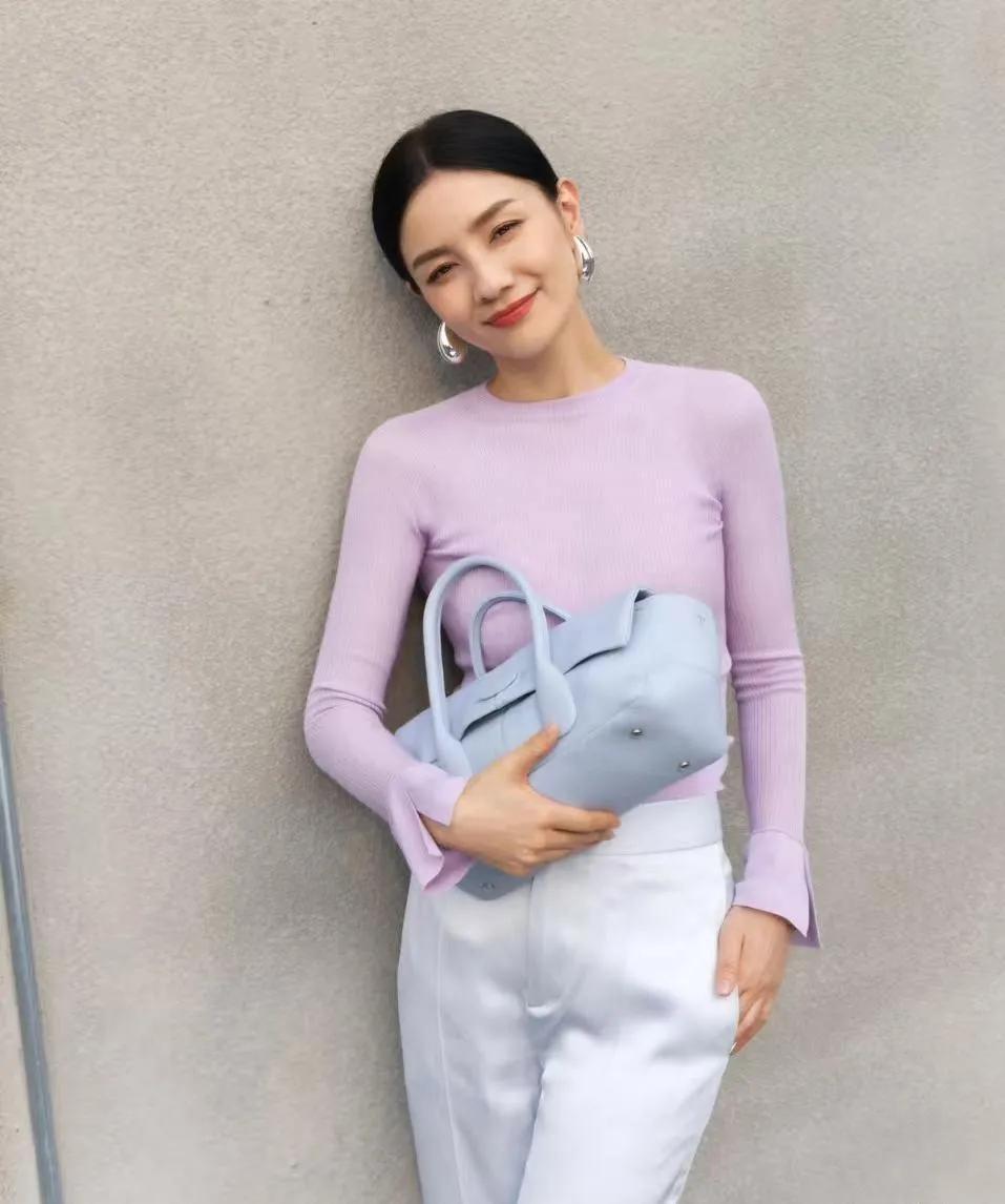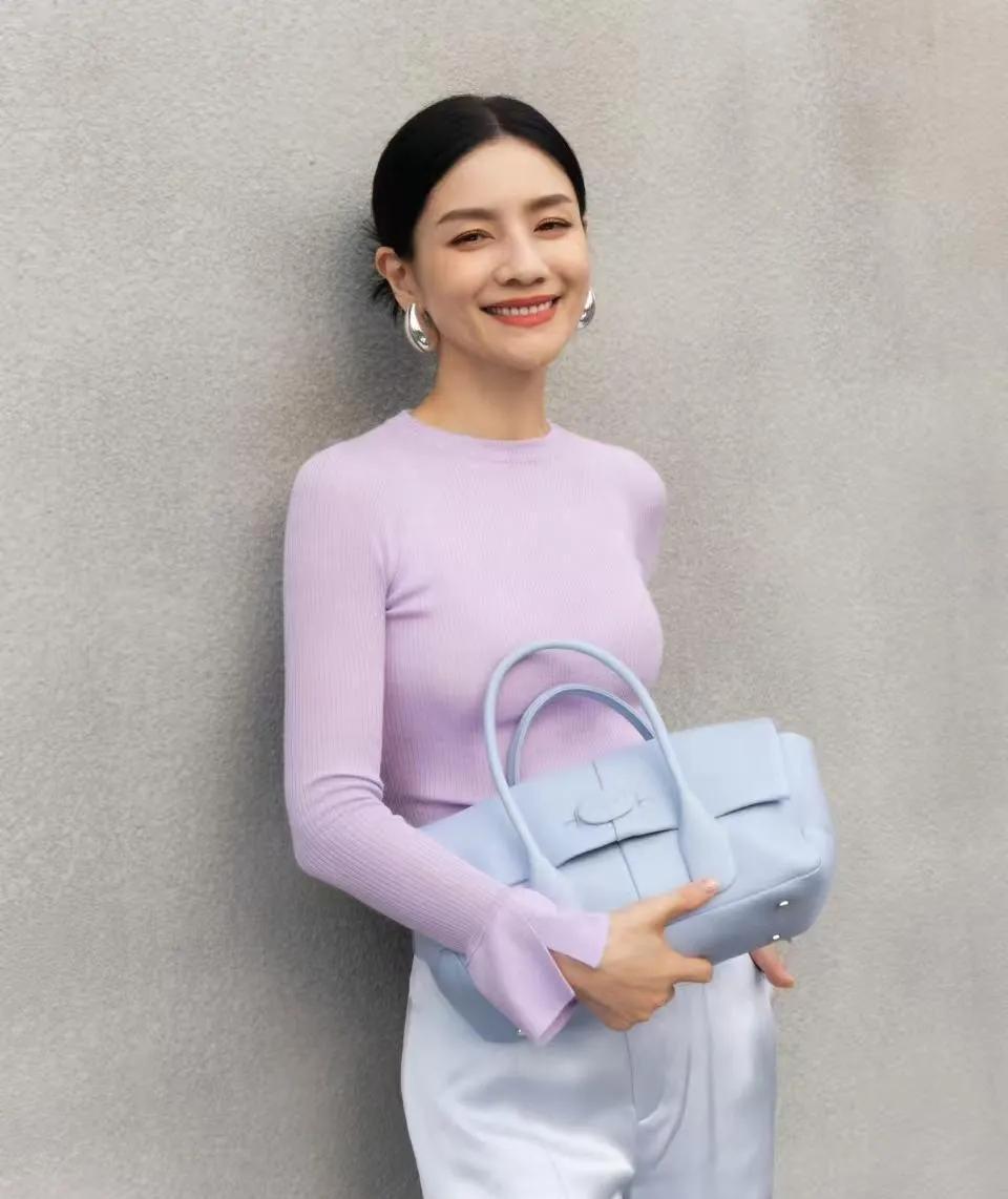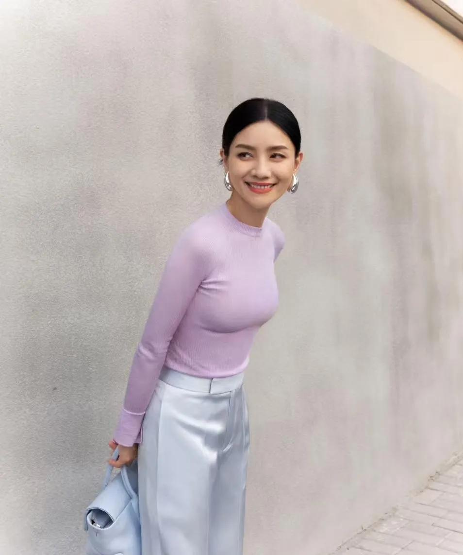 胡可的中年穿搭太值得抄作业了💜 胡可这身淡紫色针织衫+浅灰阔腿裤,温柔又高级,完全是中年女性穿搭的范本! - 淡紫色针织衫修身显瘦,袖口开叉设计增加了细节感 - 浅灰阔腿裤垂坠感满分,中和了上半身的紧身感,利落又显气质 - 银色大耳环和同色系包包,让整体造型更有层次,减龄又不失优雅 40+的状态也太绝了,皮肤紧致,笑容明媚,这种从容又精致的美真的太戳人了! 胡可 明星穿搭 中年女性穿搭