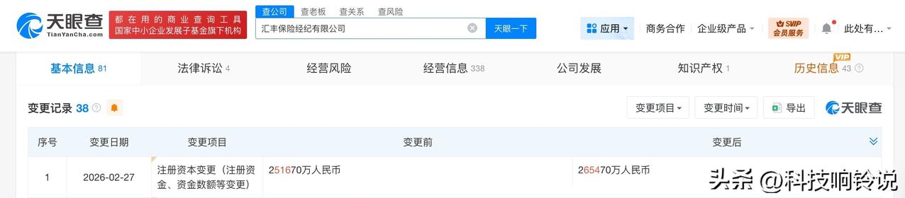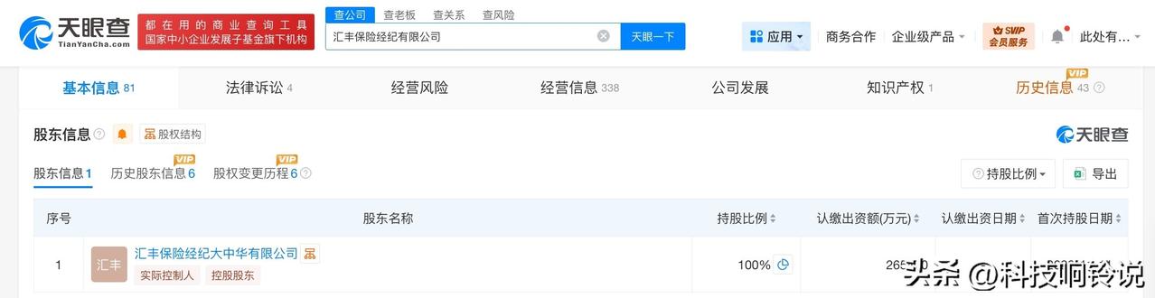 【汇丰保险经纪公司增资至约26.5亿】 天眼查工商信息显示,近日,汇丰保险经纪有限公司发生工商变更,注册资本由约25.17亿人民币增至约26.5亿人民币。 该公司成立于2012年4月,法定代表人为周莉莉,经营范围为保险经纪业务、公募证券投资基金销售。股东信息显示,该公司由汇丰保险经纪大中华有限公司全资持股。 天眼查信息: