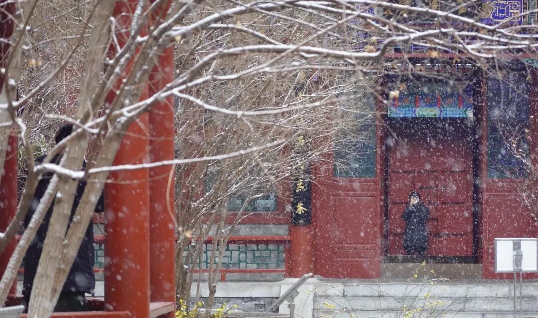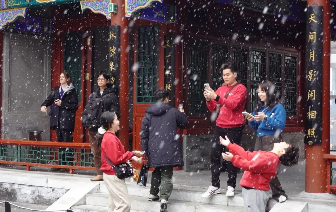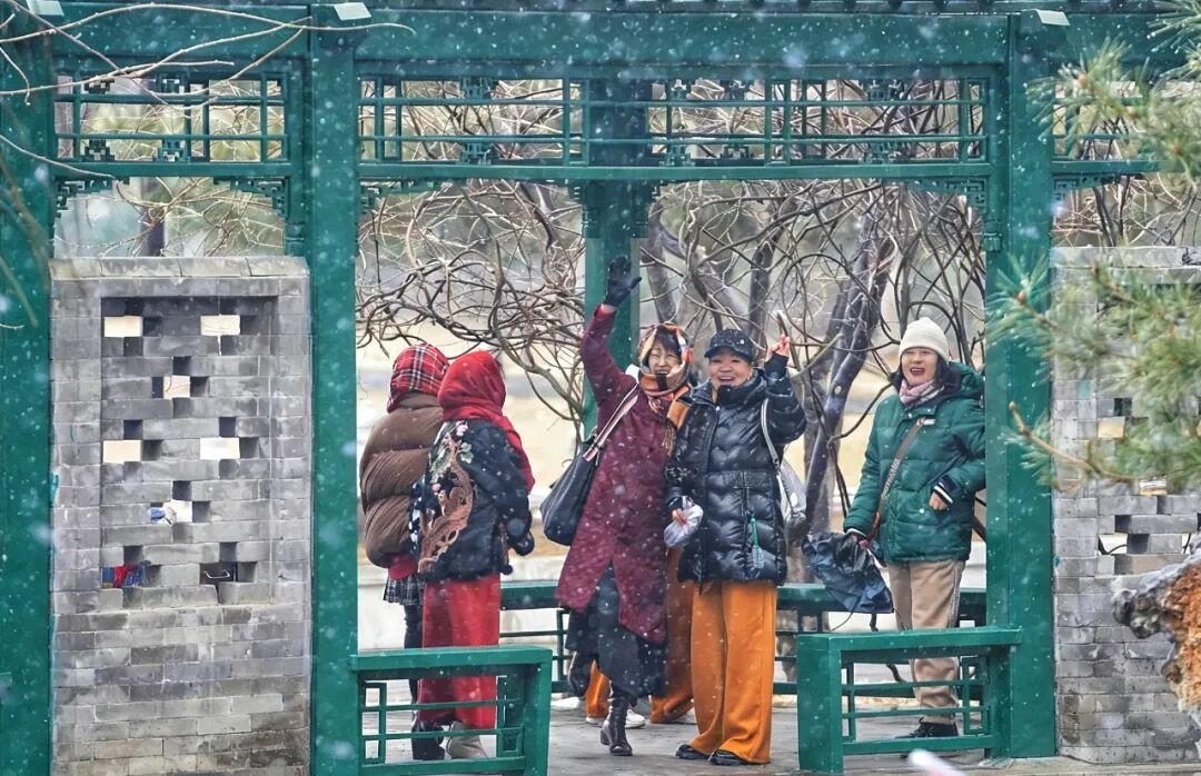 元宵节前夕,北京迎来瑞雪。在城区主干道上,串串红灯笼格外醒目,与飘落的白雪相映成趣。公园的亭廊下,市民驻足赏雪。