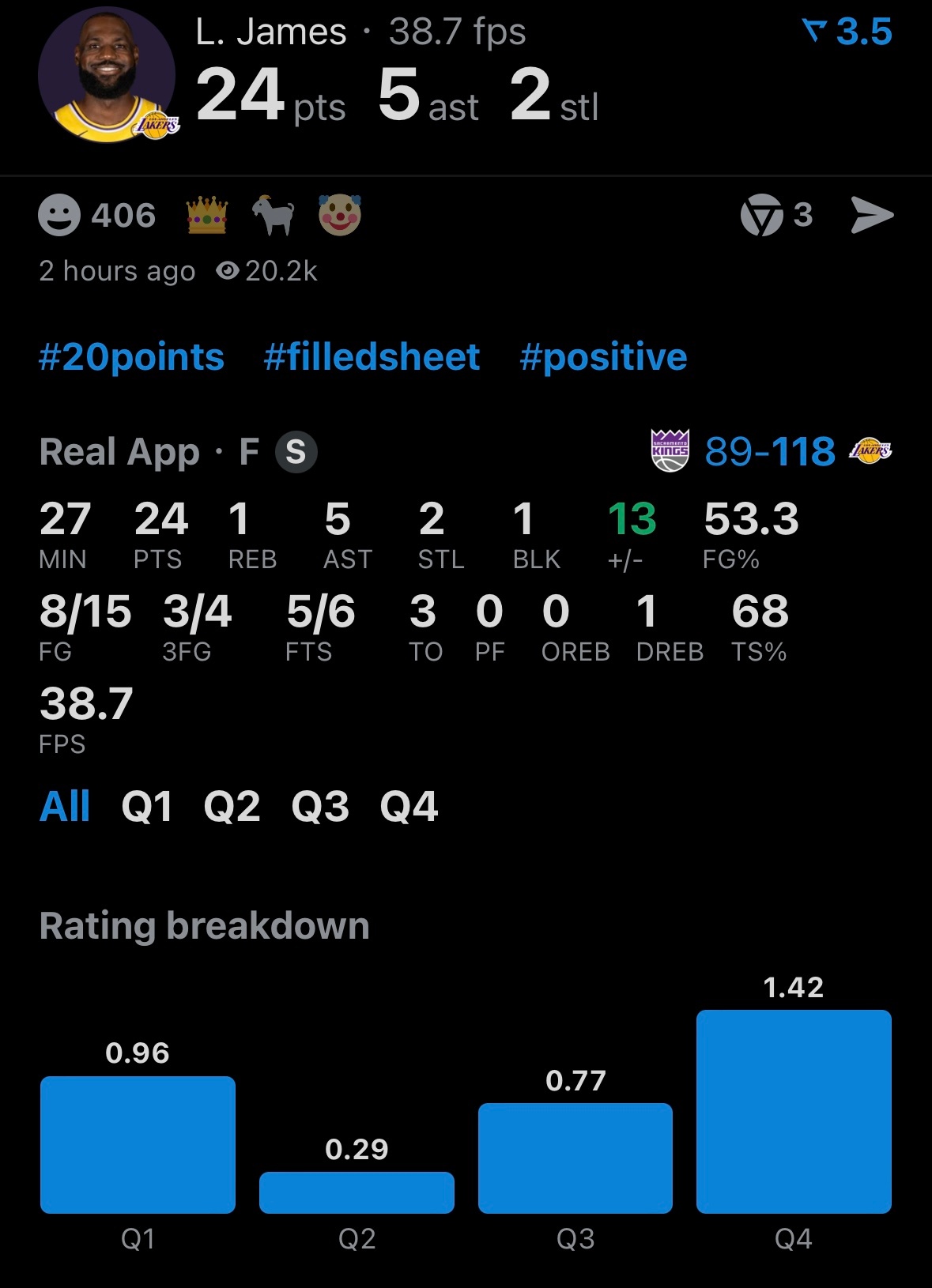 打卡下班!詹姆斯出战27分钟24分1板5助攻2抢断1盖帽,投篮15中8,三分4中3,6罚5中,正负值+13。 国王vs湖人