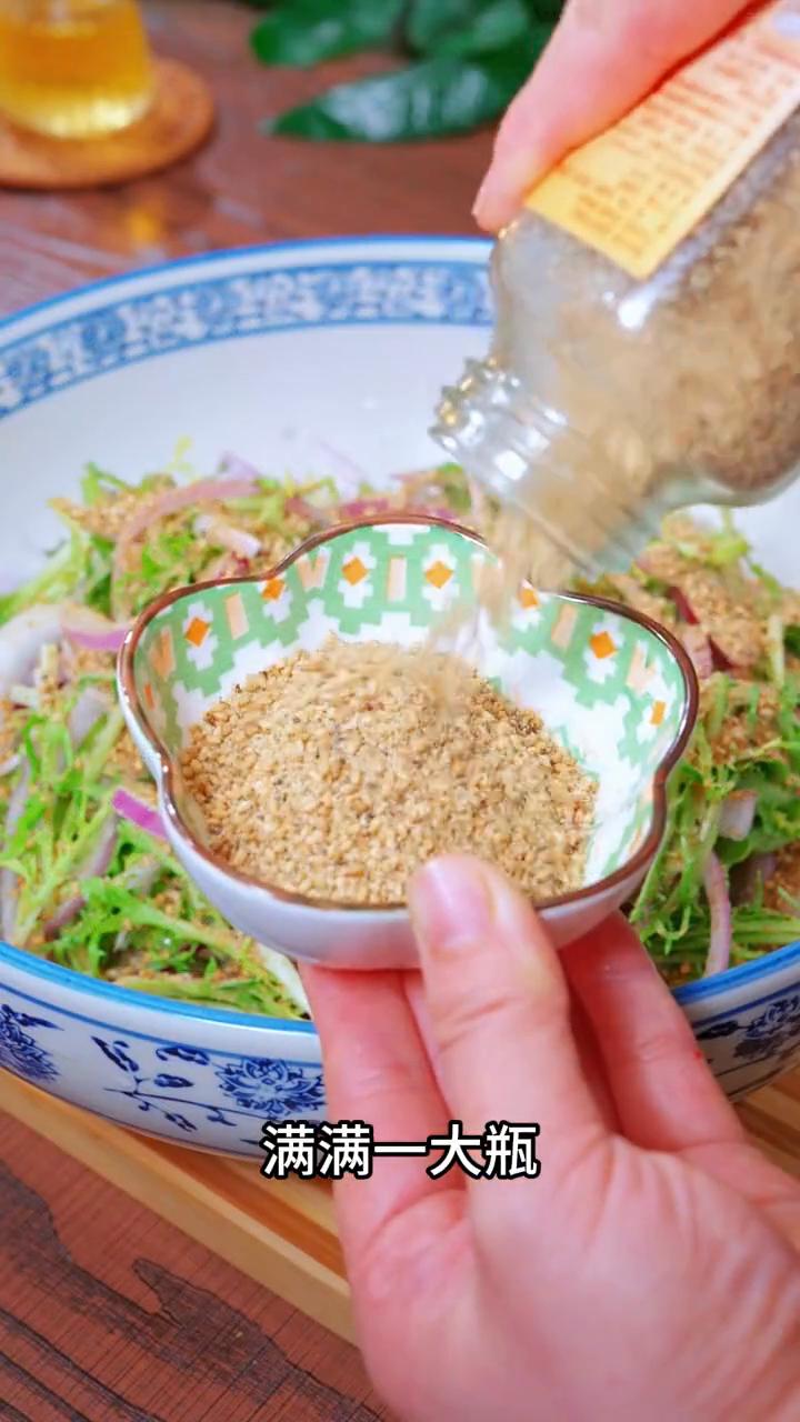 洋葱拌苦菊。 我是万万没想到洋葱和苦菊的搭配居然这么好吃,这是老一辈人传下来的土方法,清脆爽口,不仅营养丰富而且特别好吃。 ·首先选用紫皮洋葱,它的花青素含量是白洋葱的好几倍。 ·切好丝的洋葱放入大碗里,再把八毛一斤的苦菊去根切成段,加入一勺食盐,再倒入适量清水浸泡十分钟。这一步非常重要,盐水能够很好的去除洋葱的辛辣味,还可以防止氧化变黑。 ·控干水分捞出放入大盆里,加入一勺香油。好吃的关键是倒入一点亚麻籽芝麻盐,满满一大瓶可以用很久,平时可以用来拌沙拉、拌凉菜都非常的好吃。 配料表只有亚麻籽、奇亚籽、芝麻和盐,家里老人小孩都可以放心吃。 注重饮食的姐妹们还不知道亚麻籽芝麻盐在哪里有的可以点我头像。