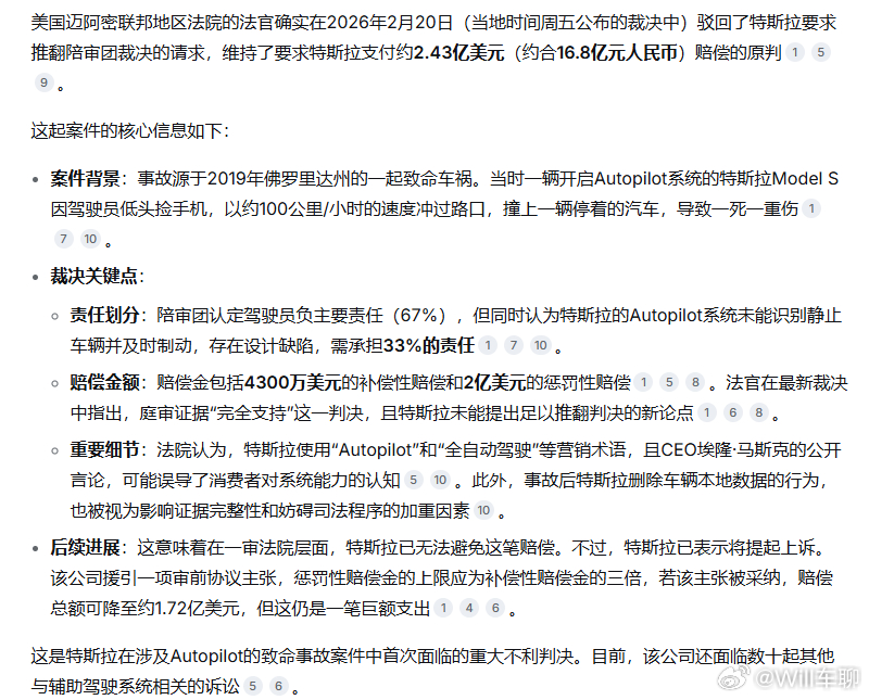 2026年2月20日,美国地区法院驳回了特斯拉要求推翻陪审团裁决的请求,维持了要求特斯拉支付约2.43亿美元(约合16.8亿元人民币)赔偿的原判,其中包含了2亿美元的巨额惩罚性赔偿。
