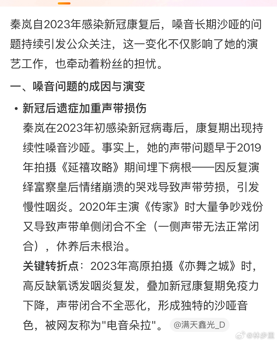 秦岚拍延禧攻略大哭戏引发咽炎那么严重,还是病毒叠加的缘故。她的时间线还是蛮明显的(图2),那年阳康后嗓子就一落千丈了……而当事人除了当时解释了一下以外,也不提这茬了。还是得新冠,总是能美美隐身。