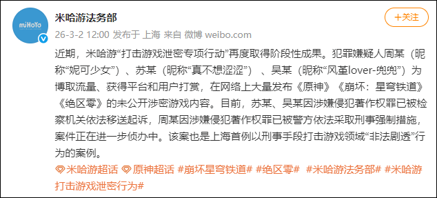 近期,米哈游“打击游戏泄密专项行动”再度取得阶段性成果。犯罪嫌疑人周某(昵称“妮可少女”)、苏某(昵称“真不想涩涩”)、吴某(昵称“风堇lover-兜兜”)为博取流量、获得平台和用户打赏,在网络上大量发布《原神》《崩坏:星穹铁道》《绝区零》的未公开涉密游戏内容。相关行为破坏了部分玩家探索游戏新版本的乐趣、扰乱正常的游戏运营节奏与健康的社区生态,并对游戏及厂商的声誉造成严重负面影响。目前,苏某、吴某因涉嫌侵犯著作权罪已被检察机关依法移送起诉,周某因涉嫌侵犯著作权罪已被警方依法采取刑事强制措施,案件正在进一步侦办中。该案也是上海首例以刑事手段打击游戏领域“非法剧透”行为的案例。