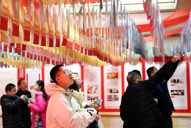 在山东省图书馆总馆一楼展厅,五彩斑斓的灯笼形制的灯谜错落悬挂,近万条灯谜跃然纸上,带来富有冲击力的视觉体验,成为一道亮眼的风景。现场既有白发老者驻足灯前凝神思索,也有孩童牵着家长的手大声猜谜,更有年轻读者三五成群探讨谜底,欢声笑语间,勾勒出一幅其乐融融的元宵民俗图景。