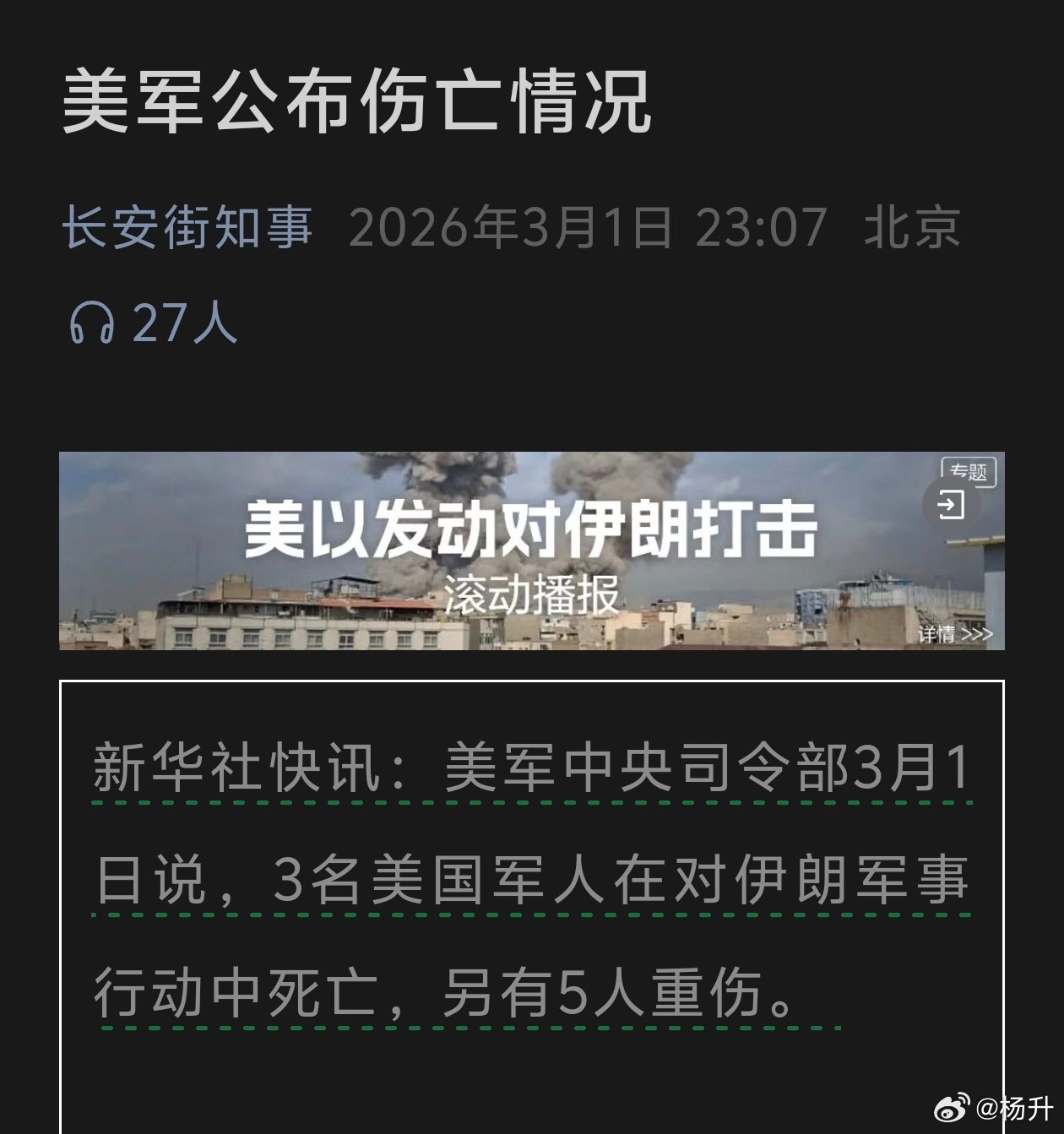 3名美军死于对伊朗军事行动 这是美国🇺🇸方面第一次公开自己一方的伤亡数字,3人死亡5人重伤,虽然人数不多,但相比之前苏莱曼尼那回还有去年空袭伊朗核设施那次,这次美国总算是付出了伤亡代价,伊朗🇮🇷也是不容易啊,自己这边被打得这么惨,也能尽可能挠下几道血印子……这几个人估计有可能是舰上的海军,也有可能是美军那几个基地里的人员