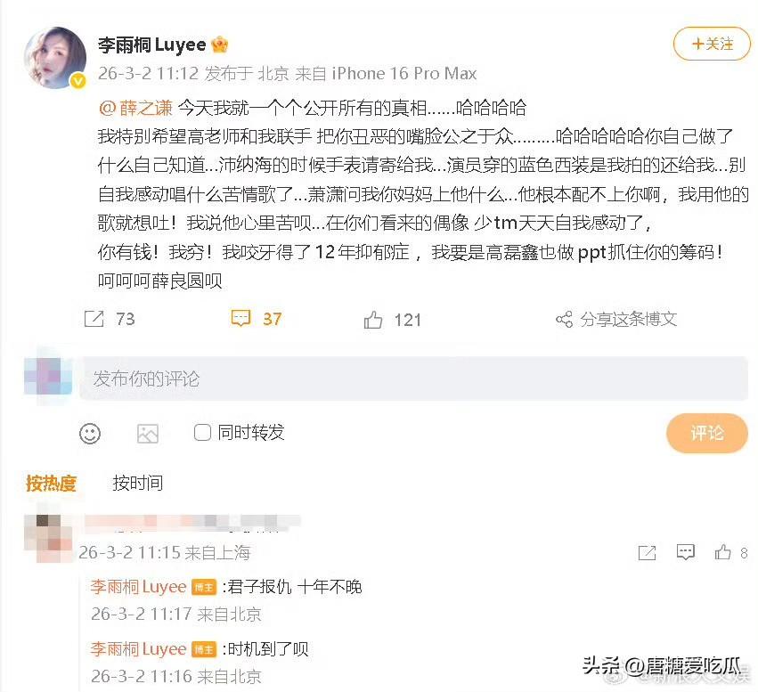 今天最不开心的应该是薛之谦吧 不是他的演唱会筹备的不顺利 而是李雨桐说君子报仇 十年不晚,今天找准薛之谦,要和他算账了。 薛之谦估计都想不明白,都过去这么多年了,他都重新站起来了,演唱会场场爆满了,怎么李雨桐又出来了。 李雨桐是薛之谦以前谈过的女朋友,分手这么多年了还没放下也是真爱吧,不管对错这次应该对薛之谦没什么影响吧,毕竟他什么大风大浪都见过了。