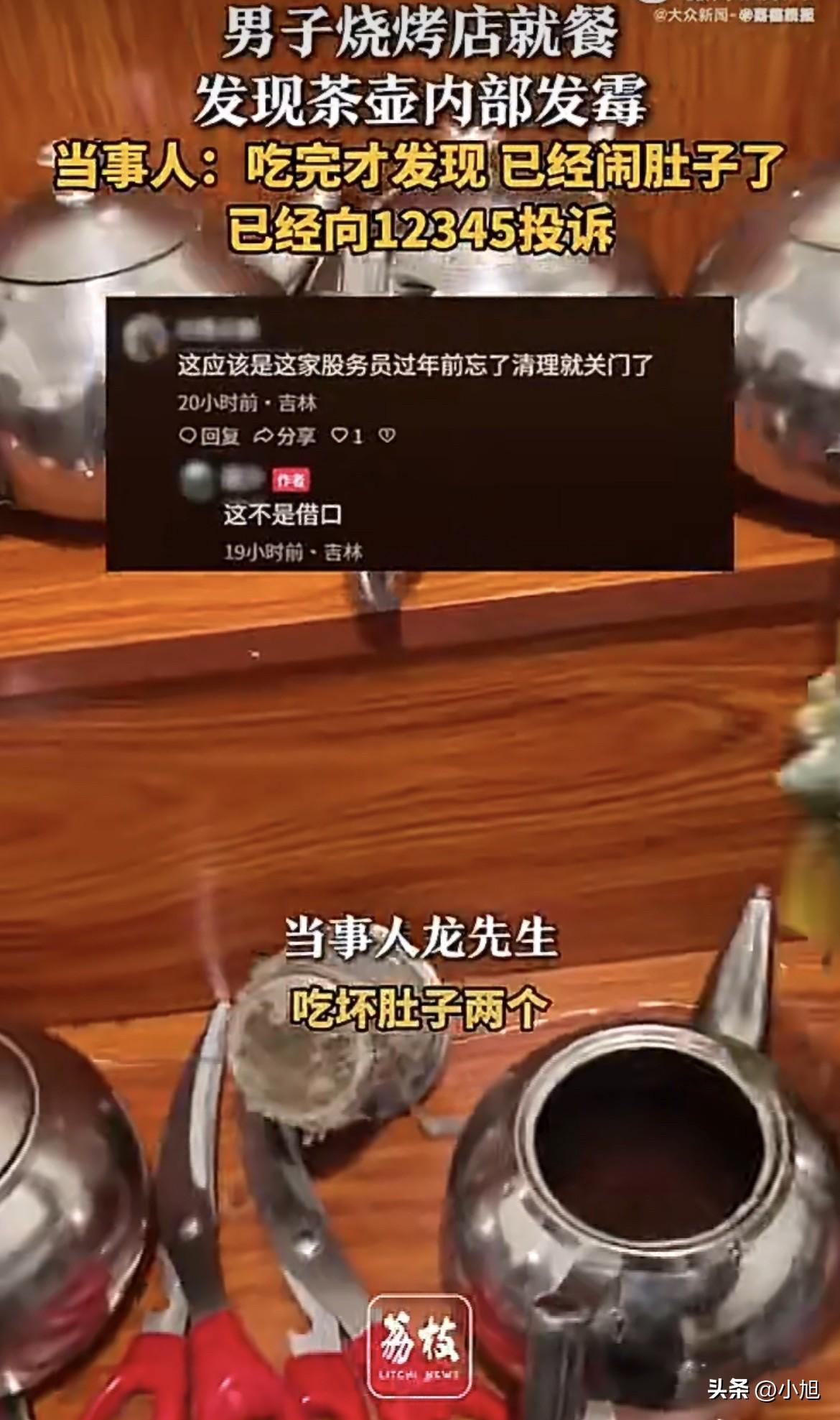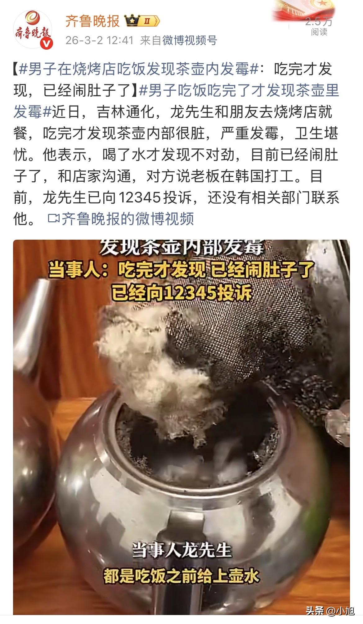 跟朋友吃顿烧烤,茶水喝饱了才发现,茶壶里长满了毛! 吉林通化的龙先生,跟熟人走进一家常去的烧烤店。服务员端上免费茶水,本地人吃饭都这习惯,一壶茶几盘肉,没人会盯着茶壶看。肉烤得滋滋响,大家碰杯聊天,一顿饭吃了近两小时。 据龙先生自己说,他们以前也来过这家店,压根没想过茶壶内部会是啥样。 快吃完准备走人,龙先生随手拎起茶壶想倒掉最后一口,无意间往壶嘴里瞟了一眼——这一看,后背直发凉。壶嘴根那块儿,黑乎乎的长毛了,一坨一坨的,明显是长时间没刷过。 他赶紧拧开壶盖,壶壁上滑腻腻一层污垢,底儿还沉着不明颗粒。龙先生当时就恶心坏了,想起刚才几杯水下肚,胃里一阵翻腾。果不其然,他告诉记者,回家没多久肚子就开始闹腾,跑了好几趟厕所。 回头找店家说理,怎么着也得给个说法吧。结果店员听了,轻飘飘甩过来一句:老板去韩国打工了,不在。这话把龙先生噎得够呛。老板在韩国打工?那这店谁管?卫生谁负责?合着老板不在,店就能这么糊弄? 他当场拨了12345投诉电话。可等了一天、两天,直到现在,没一个相关部门联系他。 按规定,像这种消费投诉,市场监管部门收到投诉后,应该在7个工作日内作出受理或者不予受理的决定,并告诉投诉人。龙先生投诉好几天了,按规定现在正处在相关部门决定受不受理的期限内。工作人员得先核实这事儿归不归他们管,证据全不全,然后再联系双方调查。 这事儿搁谁身上都得窝火。花钱吃饭,结果喝了发霉水,肚子还吃坏了。店家一句老板不在就想推干净,这理由也太荒唐了。其实像茶壶这种死角,最容易藏污纳垢。热水一泡,霉菌毒素溶进水里,肉眼根本看不见。店家要是有点心,每天开门第一件事就该检查这些细节。 现在龙先生的投诉还没下文。12345接了电话,流程走到哪一步没人知道。按规定,这事儿市场监管部门必须管,经营者得对提供的商品和服务负责。如果核查属实,这不光是赔礼道歉的事儿,还可能面临行政处罚。 您说,老板去韩国打工了,店里的卫生就能没人管了吗?您遇到过这种推卸责任的店家吗?评论区聊聊。