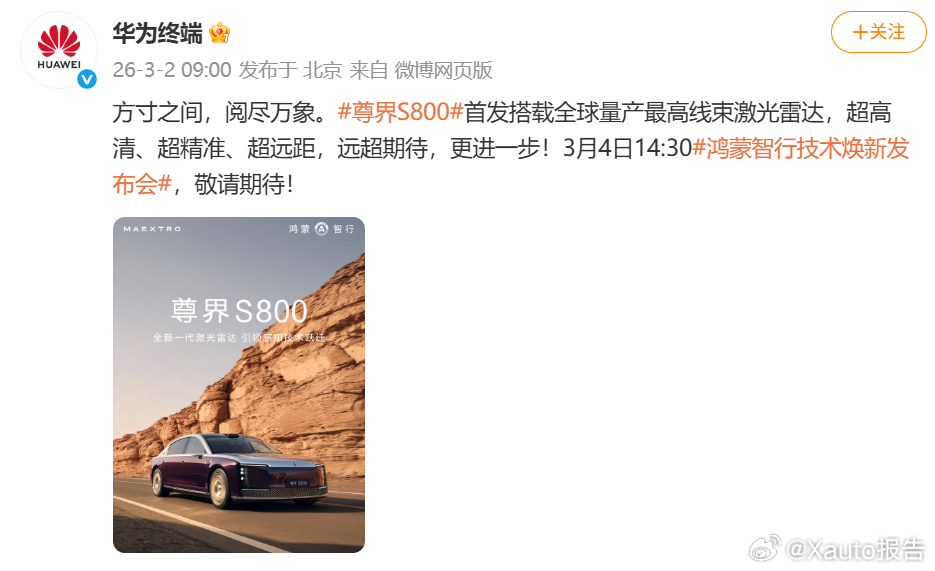 3月2日,华为终端正式官宣,鸿蒙智行旗下尊界S800将成为全球首款搭载全新一代最高线束量产激光雷达的车型,其智能感知能力将实现超高清、超精准、超远距的全面跃升。3月4日举办的鸿蒙智行技术焕新发布会上正式公布。汽场全开尊界s800鸿蒙智行技术焕新发布会定档3月4日