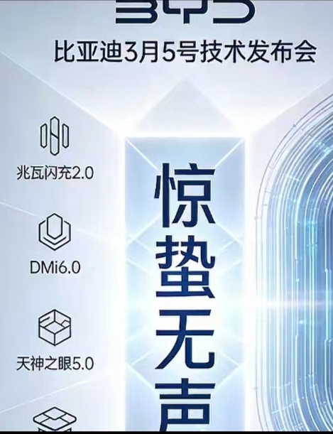 3月5号比亚迪发布颠覆性技术网传有多项新技术发布,例如更快的兆瓦闪充2.0,第六代DMI,还有更好用更智能的天神之眼5.0,还有新技术,比亚迪开年就要放大招了,选择3月5日这一天是惊蛰,要给大家惊喜。股票市场反应良好,大涨7%。过两天我要去深圳看看。比亚迪股票大涨7%