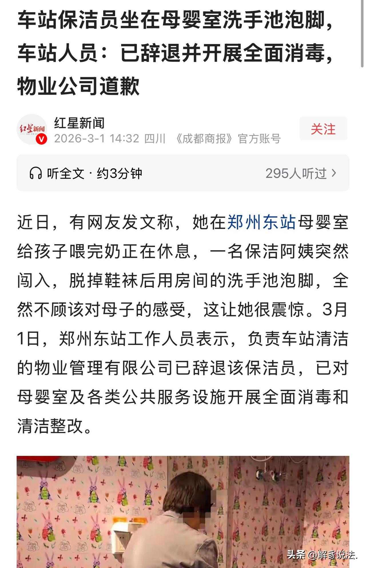“素质太低了!”河南郑州,一宝妈在某车站里的母婴室给孩子喂奶,一保洁大妈大摇大摆的进来了,当宝妈是空气,无视她的存在,自顾自的脱掉鞋子和袜子,在洗手池里泡脚。女子看到这一幕差点没惊掉下巴,心里泛起膈应。女子看了看大妈,又看看了看墙上贴着的“全面呵护健康” 的标语,觉得莫名的讽刺。将这一幕拍下视频,随后,将此事反映给了服务台。结果,大妈悲剧了。 最近,一宝妈上传到网上一段视频,引发广泛关注。 2月27号,河南郑州东站的母婴室,一位宝妈抱着刚喂完奶的宝宝在里面休息,本来安安静静的,结果突然被人打断了。 推门进来的是一位穿着灰色工作服的保洁阿姨,她看了一眼屋里的宝妈和孩子,一句话都没说,径直走到洗手池旁边,直接坐了上去。 接下来的操作更让人傻眼:她慢悠悠脱掉鞋子和袜子,把脚放进专门给宝宝用的洗手池里,开始泡脚,全程淡定得不行,完全不管旁边还有人,更不管这个地方是干嘛用的。 女子看了看大妈,又看来一眼旁边墙上明晃晃贴着“全面呵护健康” 的标语,觉得莫名的讽刺。 母婴室是专门给哺乳期妈妈和小宝宝准备的爱心空间,是公共场所里为数不多能让人安心带娃的角落。 女子认为不是自己太矫情了,这里的水池,是给宝宝洗手、洗屁屁、冲奶瓶用的,不是给人泡脚的,这样非常不卫生。 她也理解,保洁工作确实辛苦,站一天脚累、脚脏,但可以找个没人的工具间、休息室去洗一下脚,该有的职业素养应该有的。 可问题就在于,她明明看到母婴室里有宝妈和熟睡的孩子,还明目张胆这么做,连一句解释、一句抱歉都没有,这种无视和理所当然,才最让人膈应。 宝妈当时也很无奈,抱着孩子不方便争执,只能先去服务台反映情况。 工作人员听了很重视,马上上联系了保洁主管。 但因为要赶车,宝妈没等处理结果就离开了,只能把视频发出来,提醒更多带娃出行的家长。 视频一曝光,网友们直接炸了。 有人说:保洁是搞卫生的,结果自己最不讲卫生。 有人说:辛苦不是不讲公德的理由! 还有人翻出旧视频,发现早在去年11月,就有网友在郑州东站同一个母婴室,拍到过保洁阿姨在水池泡脚。 这说明什么?这不是偶然一次的失误,很可能是长期没人管、没人提醒,才养成的坏习惯。 好在事情发酵后,车站和物业很快给出了处理结果:涉事保洁员已经被辞退,物业公司公开道歉,对母婴室全面消毒、更换设施,铁路部门也责令物业彻底整改,加强管理。 《民法典》第1198条明确规定:宾馆、商场、银行、车站、机场、体育场馆、娱乐场所等经营场所、公共场所的经营者、管理者或者群众性活动的组织者,未尽到安全保障义务,造成他人损害的,应当承担侵权责任。 郑州东站作为公共场所管理者,有义务保障母婴室的卫生安全与正常使用,保洁员是物业派驻的工作人员,其行为后果由管理方承担。保洁员在母婴室水池泡脚,污染专用设施,破坏卫生条件,侵犯了母婴使用者的健康安全与合法权益,属于明显的管理失职。 宝妈作为消费者,有权要求车站停止侵害、消除危险、赔礼道歉。 如果因此造成实际健康风险或财产损失,还可以依法主张赔偿。 希望相关部门能真正加强管理,辞退一个张大妈、李大妈或王大妈治标容易,但从根上解决问题、建立长效机制才是关键。我们要让宝妈们出门安心,拥有真正温馨的港湾,别再让她们在本该被呵护的地方感到寒心。 真正的“全面呵护健康”,绝不该只是墙上那几句冷冰冰的口号,而是要刻在管理者的规章里,落实在每一个细节的行动中。